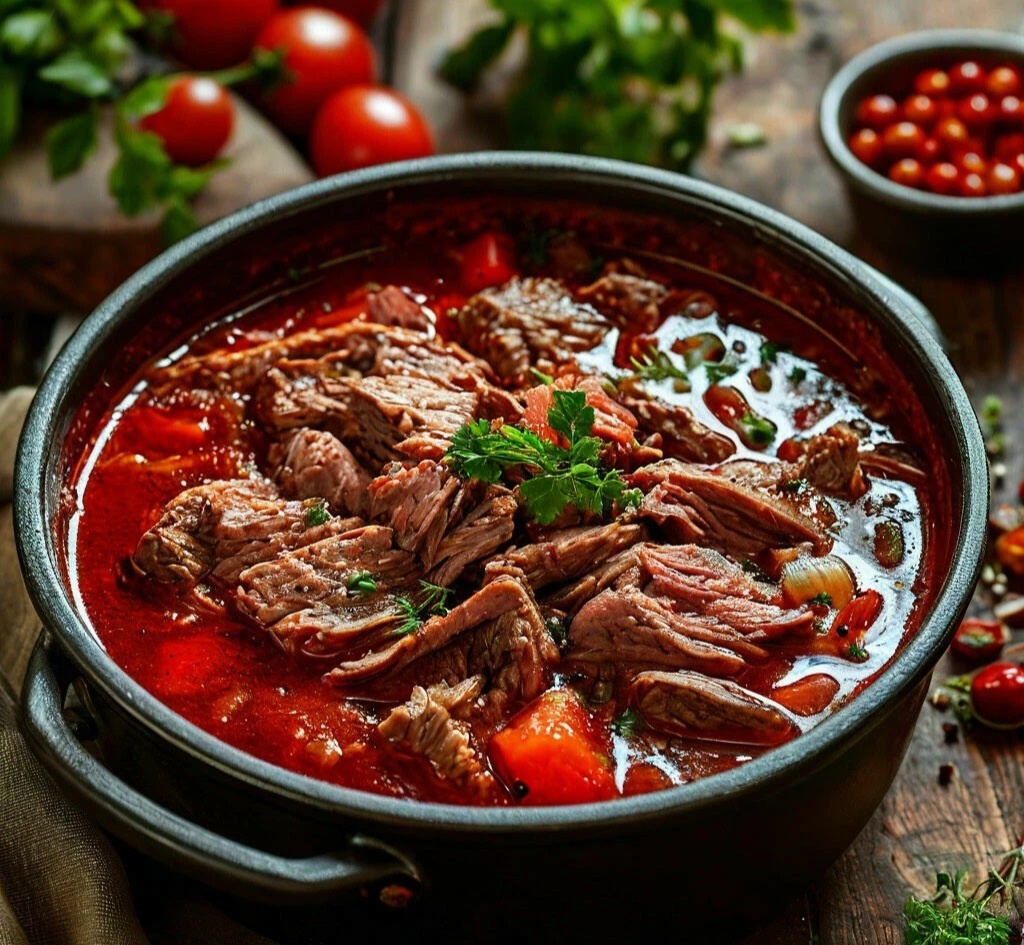 Здравствуйте дорогие читатели,сегодня мы вам расскажем как готовится один из самых вкусных борщей,который вы когда либо пробовали. Количество порций: 5 1 порция ≈ 250 г Калории: 33 Ингредиенты: Говяжий бульон - 2 л Картофель - 400 г Говядина отварная, на кости - 400 г Морковь - 250 г Лук репчатый - 150 г Лавровый лист - 3 шт Перец черный горошек - 5 гр Масло растительное - 20 мл Чеснок - 1 зубчик Свекла - 250 г Томатная паста - 40 г Красный винный уксус - 20 мл Капуста белокочанная - 150 г Сахар - 10 г Сметана 20% - 30 г Укроп - 1 веточка Способ приготовления: Шаг 1: Говяжий бульон - 2 л Картофель - 400 г Говядина отварная,на кости - 400 г Налейте бульон в кастрюлю, поставьте на небольшой огонь. Картофель и говядину нарежьте небольшим кубиком. Шаг 2: Морковь - 250 г Свекла - 250 г Лук репчатый - 150 г Морковь и свеклу натрите на крупной тёрке. Лук нашинкуйте на мелкий кубик. Шаг 3: Картофель - 400 г Говядина отварная,на кости - 400 г Перец черный горошек - 5 г Лавровый лист - 3 шт В