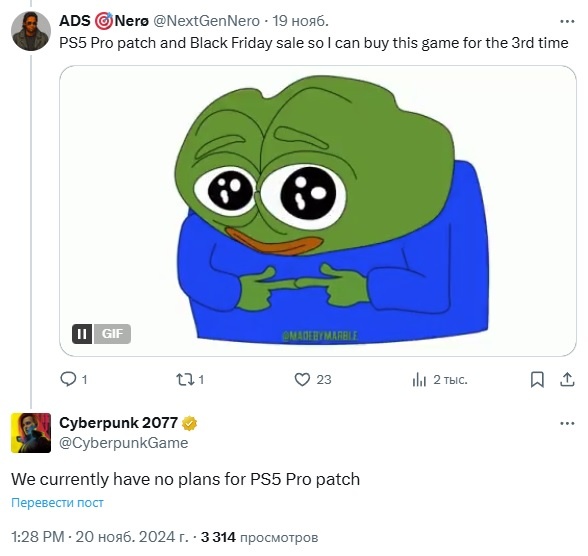 Как оказалось, в CD Projekt RED не собираются обновлять Cyberpunk 2077 под свежую консоль. Во всяком случае, именно такой ответ представители студии дали в социальных сетях: