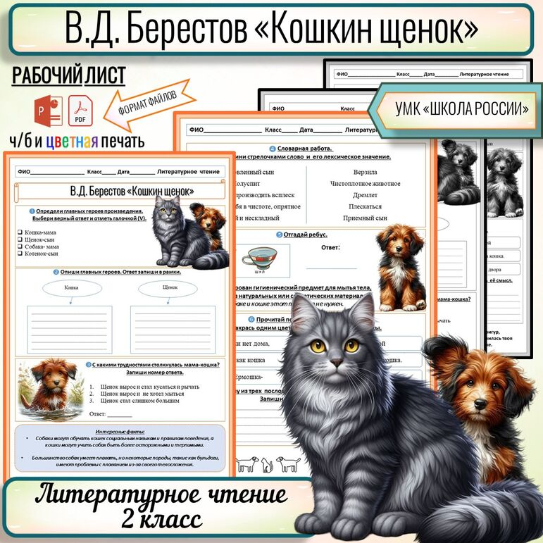 Рабочий лист В.Д. Берестов «Кошкин щенок» 2 класс Литературное чтение. Состоит из 6- ти заданий , интересного факта и рефлексии+ лист с ответами для учителя. Ознакомиться подробно можно ЗДЕСЬ