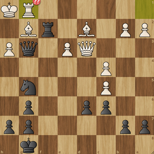 1. Лg1?? - Но это является грубейшей ошибкой, потому что черные жертвуют свою фигуру и играют... 1. ..Кf3!! - Черные нападают на ладью белых, забирать этого коня нельзя, по той причине, что белые поставят мат ферзем на h2, поэтому у белых остается только один ход... 2. Q:d6, Сейчас черные выигрывают в один ход и я предлагаю вам попытаться найти выигрышную комбинацию перед тем, как я ее покажу! 2. ..Q:g2!! - Жертва ферзя, оказывается, что белым ничего не остается как забрать его ладьей, но после того как они его заберут, то черные спокойно поставят мат!