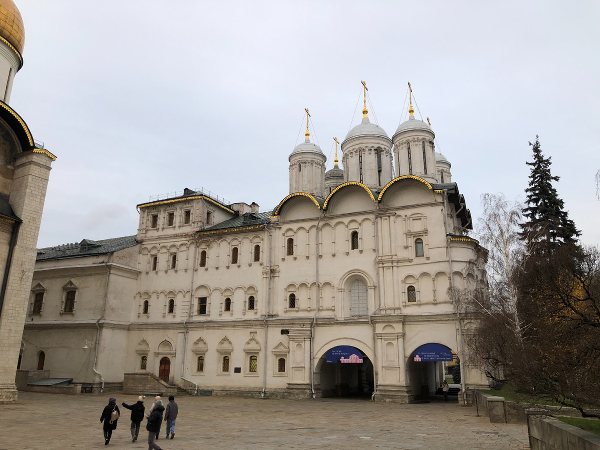 Это самый многоглавый собор в Кремле – с девятью куполами. Он предназначался для церемоний семейного характера. И раньше был соединён переходом с царским дворцом. Нижний ярус собора (подклет) сохранился с конца 14 века, это древнейшее строение в Москве. Здесь когда-то хранилась княжеская казна.