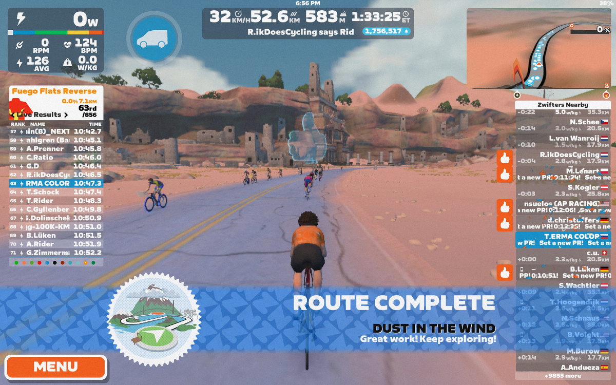Сегодня в качестве новой тренировочной трассы я выбрал "Dust in the Wind" протяжённостью 52.1 км с набором высоты (как обычно по вертикали) 582 метра. На прохождение трассы ушло немного более 1,5 часов. Темп при этом был средний, без вынимания души из тела :) Просто двигался вперёд в своё удовольствие. Скорость и каденс старался поддерживать на определëнном уровне, для поддержания ритма. На ровных участках отдыхал, в гору ускорялся. Трасса заточена для спортсменов широкого профиля, для универсалов. Очень живописные виды открываются с разных сторон. Ещё раз убеждаюсь в том, какая замечательная это программа. Хорошо продумана, прорисована, превосходная реалистичная графика. Круто! Очень хорошо видно, за что платятся ежемесячные взносы. Появилось нововведение в программе... Теперь в правом верхнем углу под картой движения показывается рельеф всей выбранной вами трассы. Курсор ведёт вас по ней, и вы точно знаете, какие подъëмы и спуски ждут вас впереди. При этом видно сколько километро