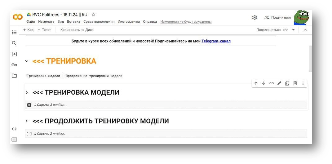 Захотелось создать кавер с помощью нейросети. Оказывается, это не так уж и легко. Расскажу вам о своей попытке. Я совсем не разбираюсь в программировании, кодах и прочих айтишных штуках, однако у меня получилось. Я потратила много времени, чтобы найти работающий, а главное достаточно удобный для обывателя способ, ну а вам достанется самый сок, сама сжатость и информативность из всех моих поисков. В этой статье я соберу все ссылки, которыми пользовалась. Хорошо, что существуют профессионалы, которые давно за нас всё сделали и объяснили, но плохо, что они раскидали свои мысли по всему интернету. Что ж, начнёмヾ(⌐■_■)ノ♪ Итак, вы выбрали песню, в которой хотите заменить вокал. Нужно выбрать голос для кавера. Есть база популярных голосов: ссылка. Но! Здесь мы будем говорить о создании своей модели. ЭТАП №1 И пошла первая ссылка: https://dzen.ru/video/watch/65ba5b3cac02d66f3a1545e4 В этом видео всё подробно рассказано, но кто хочет комментарии Дилетанта, покороче и в буковах, то милости про