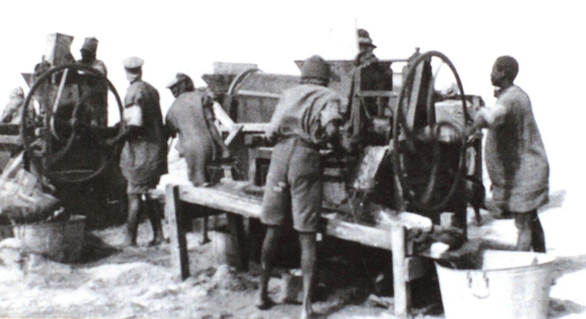 Процесс добычи алмазов - как это начиналось Первоначальный процесс добычи алмазов в запретной зоне Sperrgebiet в Намибии начался с того, что шахтеры и рабочие ползали на животах и коленях в поисках и сборе алмазов в жестяных банках из-под джема, подвешенных к их шеям. Процесс пришлось усовершенствовать, в результате чего стали использоваться сита для отделения песка от более крупных зерен, содержащих алмазы. Чарли Баннау предложил метод просеивания мелкого песка путем погружения сита с гравием в желоб, наполненный морской водой, с вращением. Более тяжелые минералы, такие как алмазы, скапливались в центре сита. Затем появились качающиеся сита «Младенцы», подвешенные на 3 цепях, обычно рабочий качал такое сито, как младенца в колыбели. Вскоре после этого последовало введение барабанного сита. Для тех старателей, которые добывали золото или алмазы самостоятельно, ящик для одного человека был идеальным вариантом. Этот специальный деревянный ящик содержал сита, кондуктор и лопату. Оборуд