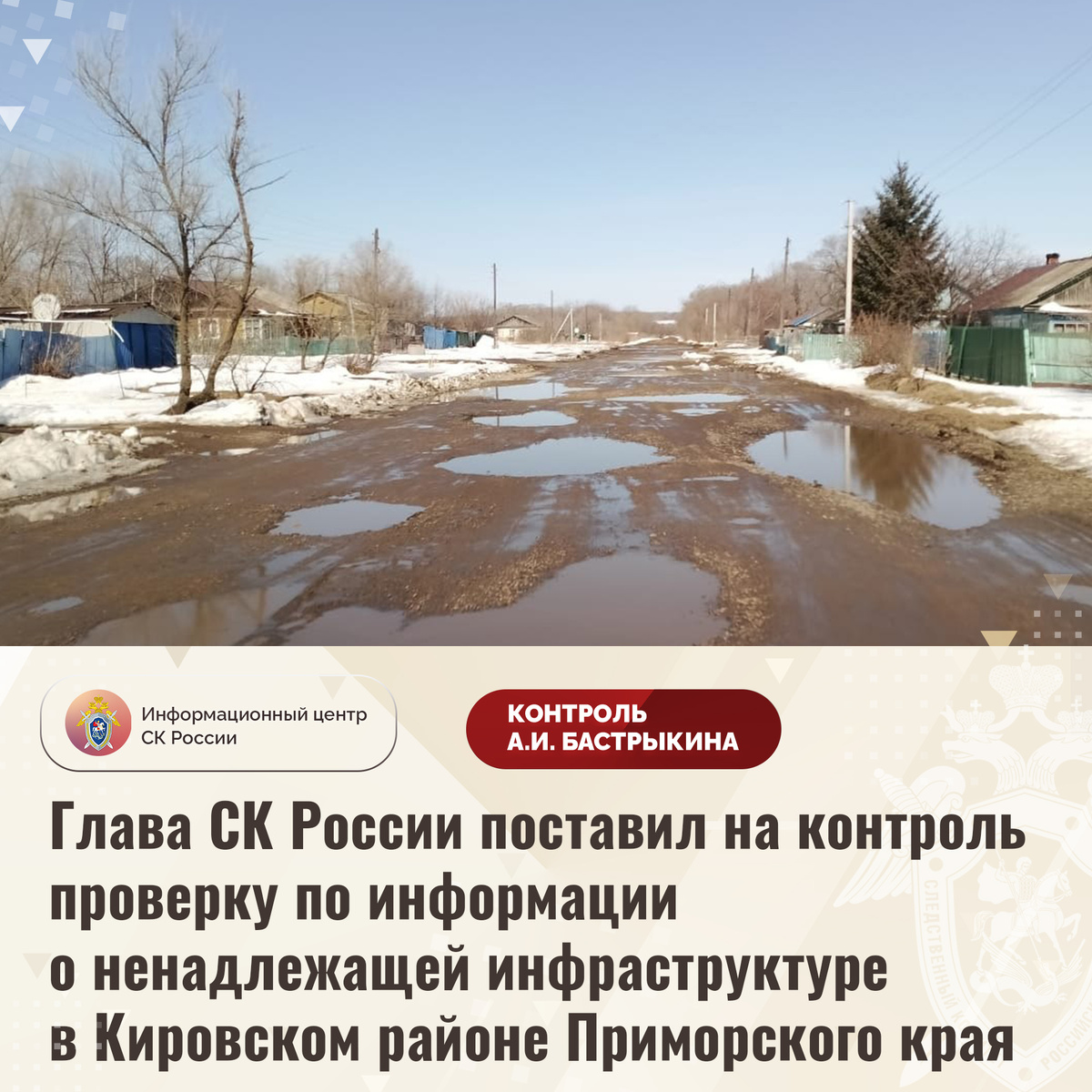 Глава СК России поставил на контроль проверку по информации о ненадлежащей инфраструктуре в Кировском районе Приморского края