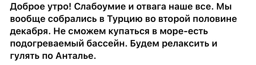 Получила от Вас, Уважаемый Читатель, классный комментарий! Хочу сказать, что отдых зимой в Турции может вызвать у Вас улыбку или недоумение. Очень многие наши люди, я знаю точно, любят тёплое турецкое море, и вода должна быть не ниже +26.