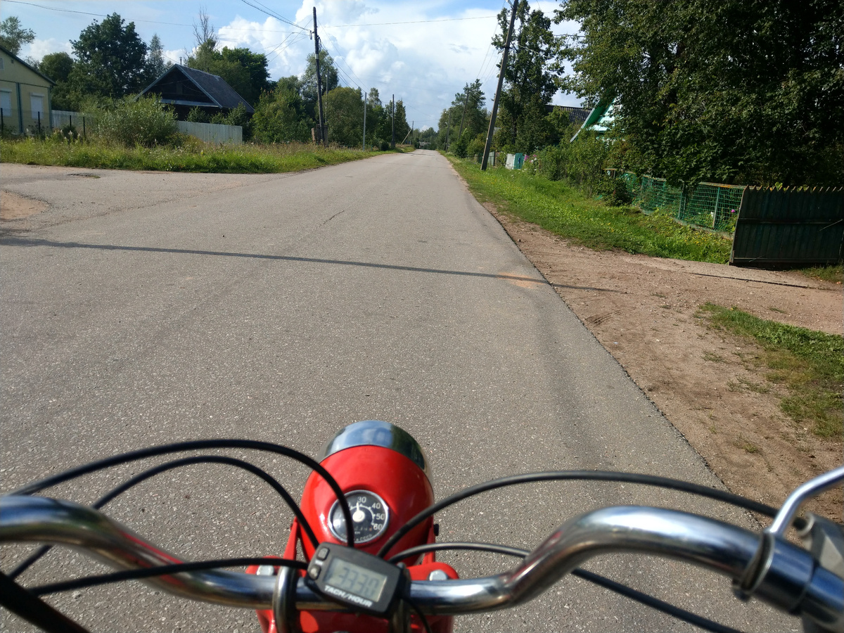 Прошу прощения за некоторое молчание. Я вернулся в город и на меня очень плотно навалилась работа. Но медведю еще есть, что вам рассказать перед зимней спячкой, поэтому давайте вспомним лето. Вдоволь намучившись с ригой 13 я решил дать себе немного расслабиться и поискать интересные локации. В целом, от моей базы осталось не так много дорог, которые являются дорогами. Был конец лета, я нашел окно в дождях и решил, что пора навестить еще одну. Давление в шинах, бензин в баке и мы в дороге. По прошествии сезона могу сказать, что 16ая не доставила мне никаких проблем. Отличным мопед для небольших локальных поездок. Вообще, изначальная цель поездки была немного в другом: я хотел найти интересные локации недалеко от базы, чтобы туда можно было катать с друзьями. Поэтому изначально я поехал на странную дорогу, которая вела меня к странному озеру. И нашел там нормальную, классическую мостовую начала века. Что повергло меня в ступор. Это дорога в лесу. На имеющихся у меня довоенных картах ее