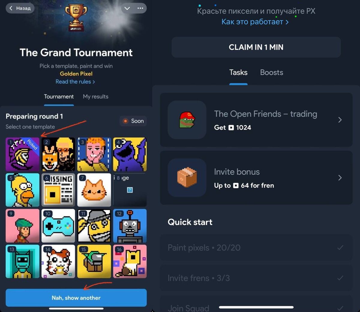🏆 Турнир GoldPixel в NotPixel и некоторые подробности Давайте немного разберемся 🌟 Будет 10 раундов, важно правильно закрашивать шаблон, будут какие-то штрафы 🌟 Каждый раунд убирают половину шаблонов и увеличиваются размеры других А зачем и как участвовать? 🏳️ Цель: получить больше $PX. Участвовать могут все 🏳️ В конце каждого раунда участники из победивших шаблонов получают $PX. Поэтому важно рисовать ⚡️ 🏳️ По итогу лучшие участники из победивших шаблонов получают по золотому пикселю 👻 Что за золотой пиксель и другие подробности узнаем позже 👻 И добавили задание на 1024 $PX (подписаться на каналы) Ждете дроп и листинг пикселя?