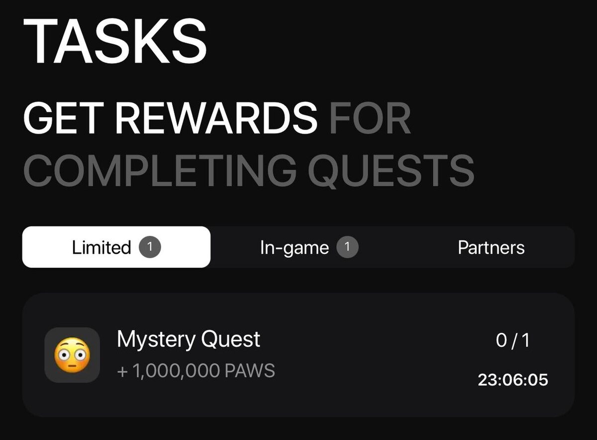 💎 PAWS новое задание Mystery Quest Секретный квест, в котором непонятно что нужно сделать!🐾 🐾Присоединяйтесь к PAWS прямо сейчас! КАК ЗАБРАТЬ 1.000.000 PAWS? 🔥 - Позвонить Дурову 👍 - Скинуть телефон с самолета 😱 - Пригласить 1000 друзей Топ самых перспективных тапалок: 1. Blum - майнер + мини игра 2. Bcoin - игра 2048 3. PAWS - запустили 1 раз и ждём раздачу.