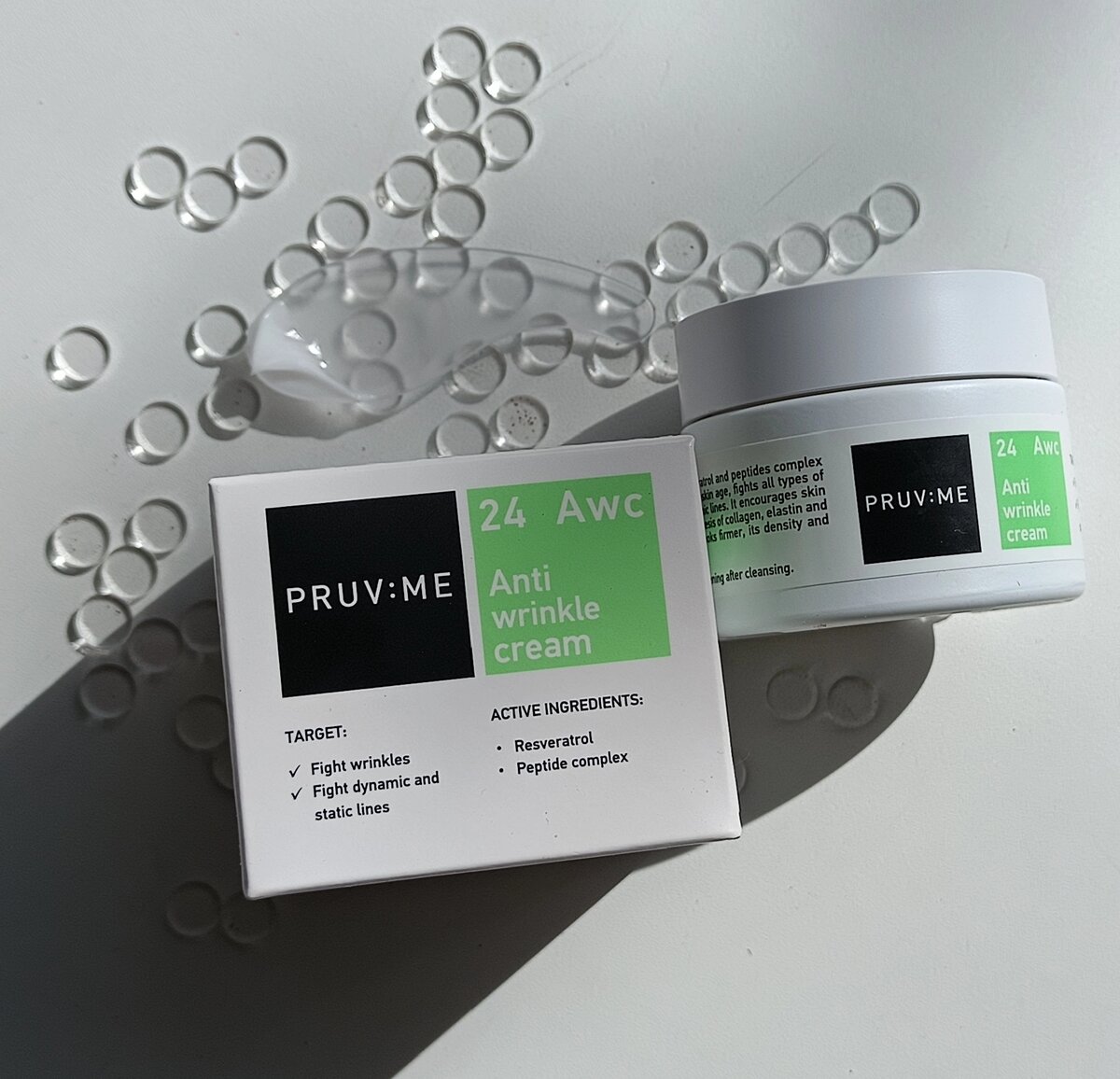 Один из важнейших врагов в борьбе за совершенство является время. Оно неустанно берет свое. Но мы делаем всё, чтобы замедлить мгновение. И для этого у нас имеется ряд секретиков, один из них уходовая косметика. В своем 38 летнем возрасте, я наконец то задалась вопросом, не стоит ли мне уже приобрести возрастную косметику для продления своего очарования. Но, чтобы уходовое средство проследовало цель не только предотвращение первых признаков морщинок, но и предполагало питательные свойства с эффектом увлажнения. Мой тип кожи смешанный, жирный с переодическими высыпаниями. Долго выбирая, читая отзывы, я остановилась на креме Южно-Корейского бренда ❤️PRUV:ME Awc 24 Anti-Wrinkle Cream❤️ Крем для лица с пептидным комплексом против морщин Активными ингредиентами крема являются ресвератрол и комплекс пептидов. Ресвератрол – это мощный антиоксидант, он обладает естественным антивозрастным эффектом - он нейтрализует свободные радикалы в несколько раз сильнее, чем витамин С. Ресвератрол содерж