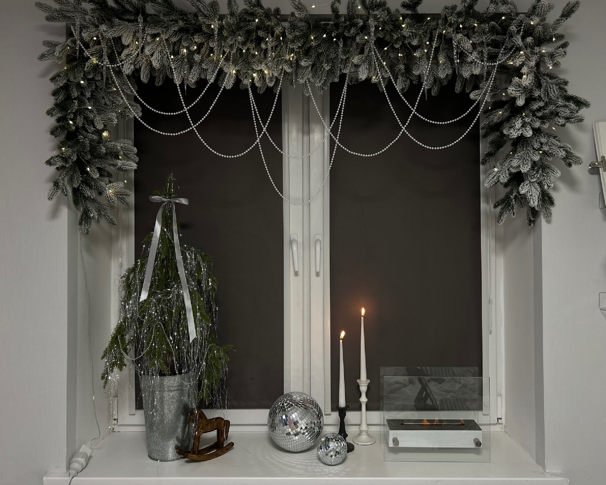 Первая зона, которую я начала украшать к Новому году — это окно в нашей спальне Так как я не стала вешать карниз со шторами, то смогла повесить гирлянду на телескопический душевой карниз *Кстати, если вы выдвинули такой карниз больше, чем нужно, то его нужно вытянуть до конца и заново вставить Я брала хвойную гирлянду от Царь Ёлка 240 см на OZON — ссылка Но ещё примеряла вот такую с WB — ссылка — тоже красивая, но мне больше понравилась заснеженная Сосульки — ссылка — взяла с запасом, их оказалось очень много Жемчужная нить — ссылка Гирлянда роса у меня 10м, на батарейках слишком быстро садятся, поэтому специально брала с возможностью включить в розетку На ёлочке тоненький дождик — ссылка Лошадка — ссылка OZON Свечи — ссылка — я взяла на 25, самые низкие, но у них есть выше А для прихожей я нашла очень красивую ледяную ёлочку — ссылка Свою ёлочку заказывала несколько лет назад на WB, но в наличии её сейчас нет 🥲 — ссылка на WB