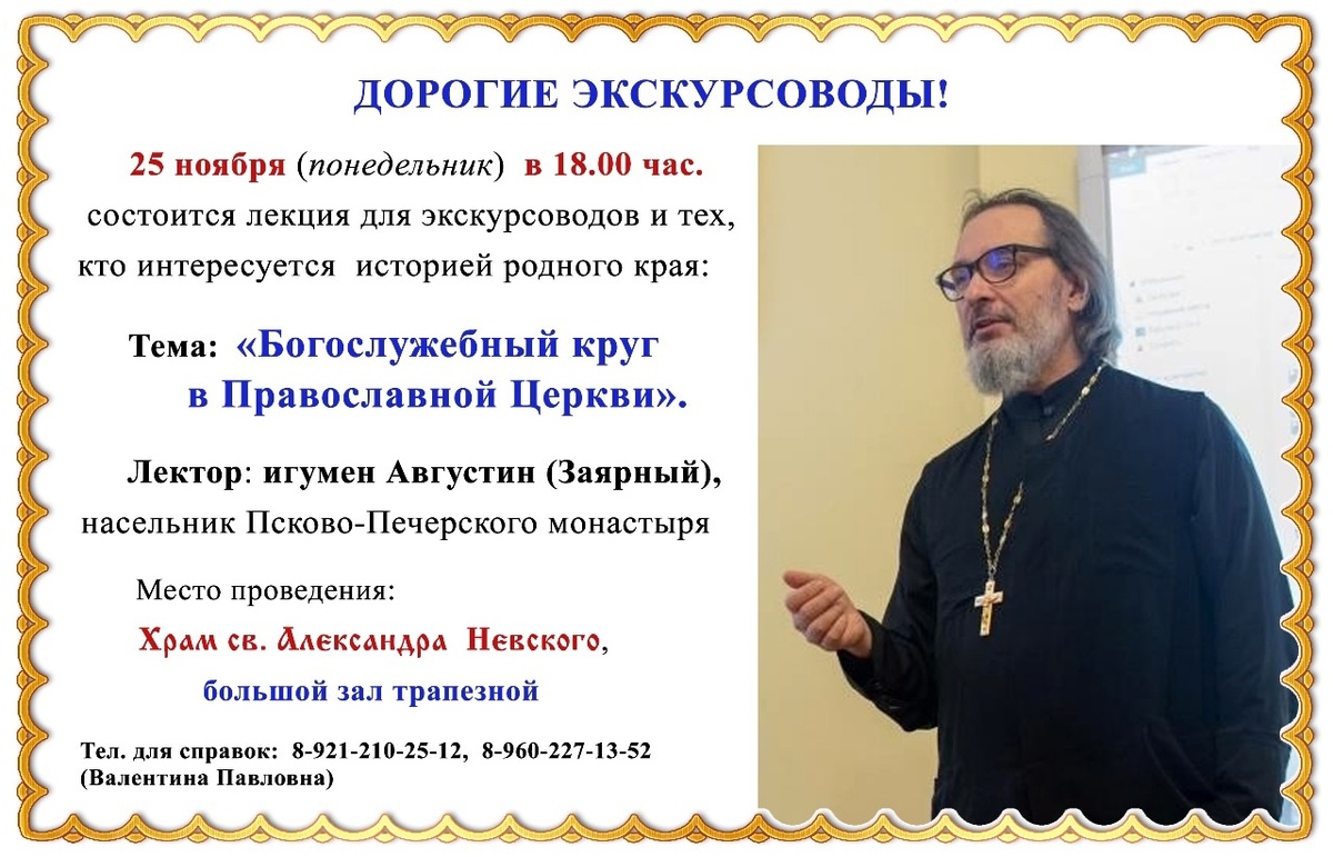 25 ноября 2024 года в 18:00 в большом зале трапезной храма святого благоверного великого князя Александра Невского города Пскова состоится лекция для экскурсоводов и тех, кто интересуется историей родного края на тему: «Богослужебный круг в Православной Церкви». Лектором выступит игумен Августин (Заярный), насельник Псково-Печерского монастыря. Телефон для справок: 8-921-210-25-12, 8-960-227-13-52 (Валентина Павловна).