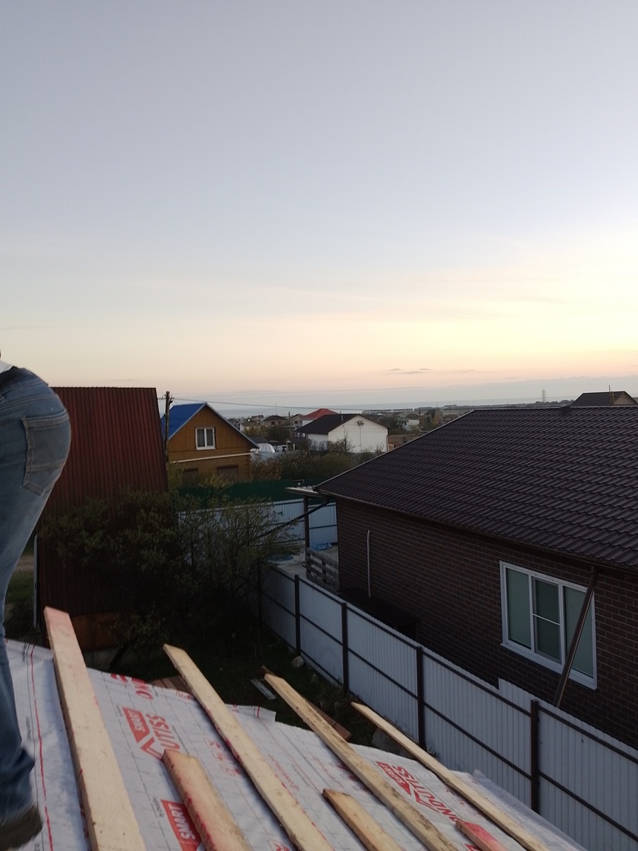 Здравствуйте! Второй целый день на каркаснике. С крыши открывается вот такой вот вид на Парус. Даже море вдалеке видно, ну и мой дом прямо по курсу. Погода позволяет отвлечься, тепло и сухо, к выходным обещают апокалипсис по Крымски, посмотрим. Стропильная система готова, можно делать пошаговую обрешетку с влагозащитой. Отпилил по нитке и по уровню концы стропил, можно и обрешетку делать. Утепление будет по перекрытию, туда и купили паропроницаемую мембрану, а под кровлю, под металлочерепицу будем использовать универсальную пленку. Она защитит от конденсата, от косого дождя, ну и может быть от задуваемого под конек снега. Пленки взяли от компании Ондутис, хорошие, современные пленки, почти все с клеевым слоем, не нужно потом со скотчем лазить эти самые швы проклеивать.. Пошаговая обрешетка под металлочерепицу, никакого контр бруска ставить не стали, кровля не утепляется, прогиб пленки под обрешеткой обеспечит вентиляцию подкровельного пространства. Крыша готова под монтаж чер