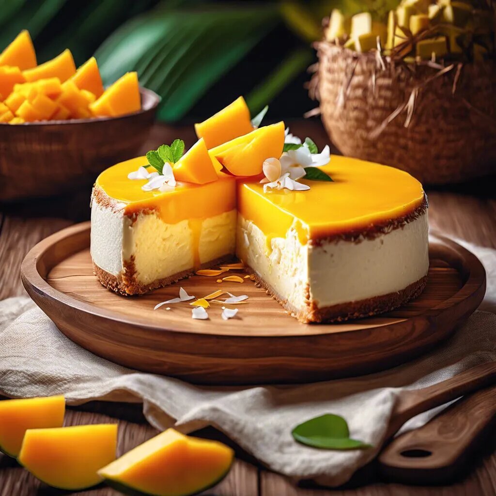 Ингредиенты: #### Для коржа: - 150 г печенья (например, «Юбилейное» или «Песочное») - 75 г растопленного сливочного масла #### Для начинки: - 400 г творога (или сливочного сыра) - 200 мл кокосового молока - 100 г сахара - 2 яйца - 1 спелый манго (или 200 г пюре манго) - 2 ч. ложки желатина - Сок и цедра 1 лайма ### Приготовление: 1. **Подготовка коржа**: Измельчите печенье в крошку и смешайте с растопленным сливочным маслом. Выложите массу на дно разъемной формы, прижимая. Уберите в холодильник на 30 минут. 2. **Приготовление начинки**: В небольшой кастрюле на медленном огне нагрейте кокосовое молоко и добавьте желатин, перемешивая до полного растворения. Снимите с огня и дайте немного остыть. 3. **Смешивание начинки**: В другой миске взбейте творог с сахаром, яйцами, пюре манго, соком и цедрой лайма до однородной консистенции. Постепенно введите кокосовую смесь. 4. **Сборка чизкейка**: Вылейте начинку на подготовленный корж и разровняйте. Уберите в холодильник на 4-5 часов (лучше на н