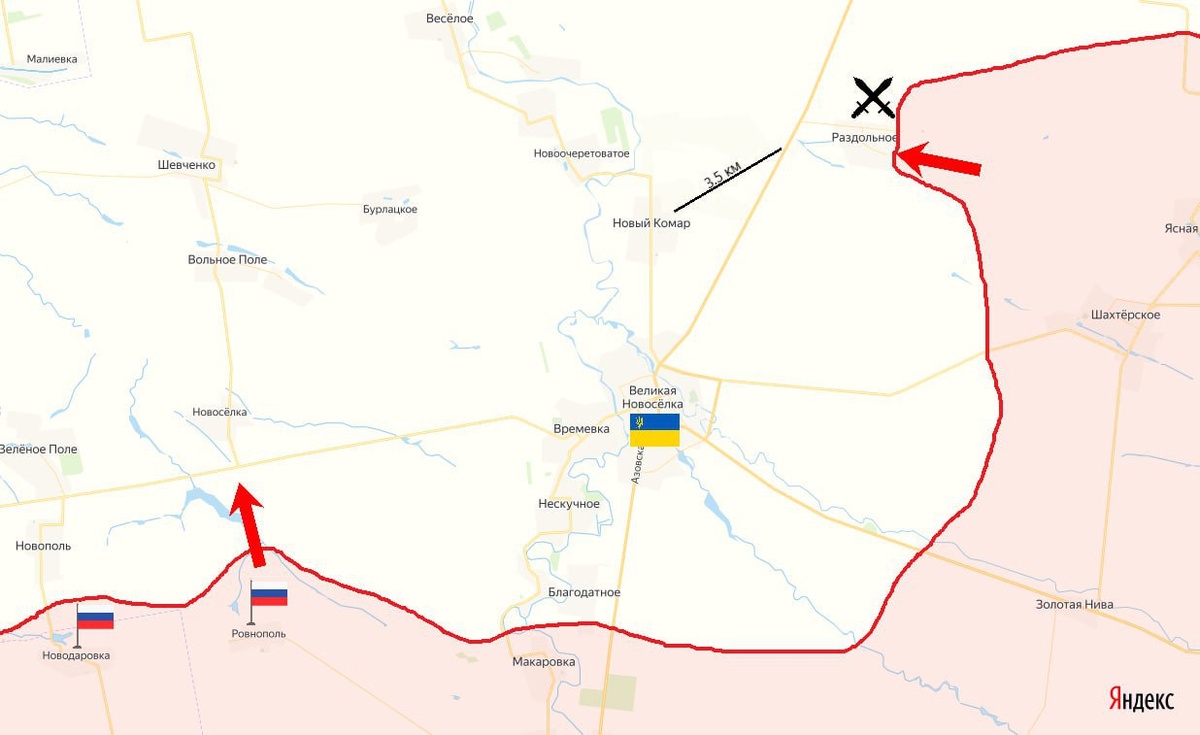 ◾️На западе ВС РФ давят в направлении Новоселки, есть угроза перерезания трассы. Кроме того, взятие населенного пункта Раздольное также прерывает снабжение украинского гарнизона. ◾️Остается одна нитка через Веселое и Новый Комар - это 3.5 км. Взятие Нового Комара закрывает и эту последнюю нитку снабжения для ВСУ. ◾️Дальше только через поля по москитной схеме. Везде, где ВСУ переходили на "москитку", оборона быстро рушилась, и противник на доставке нес огромные потери.
