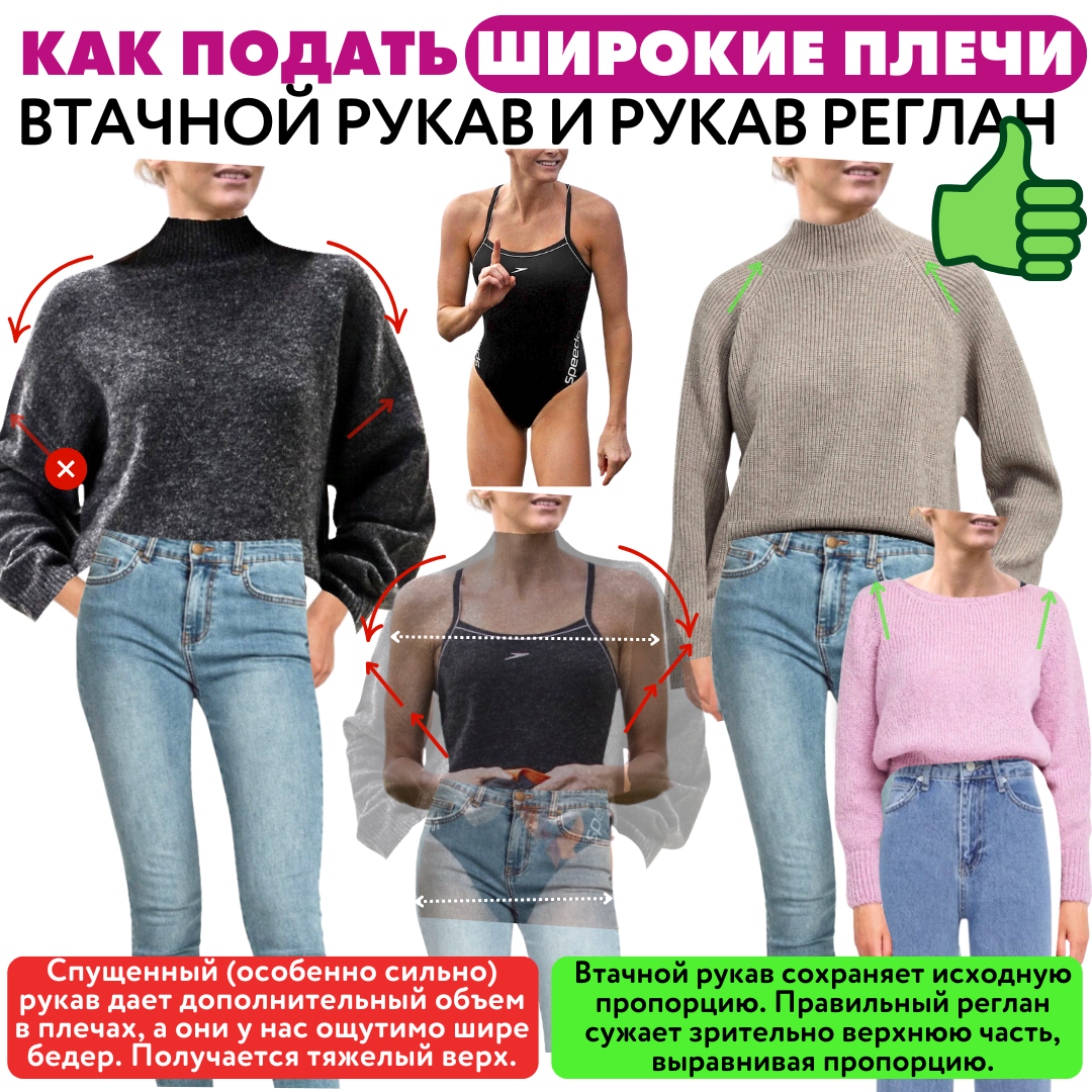 ✅ Рукавом реглан. Диагональные швы которого зрительно сужают зону плеч. И благодаря реглану можно органично носить даже широкий рукав, который многие девушки с объемными плечами носить боятся. Реглан в таком случае делает посадку на плечо более органичной, не дает объему рукава сильно изменить пропорцию.