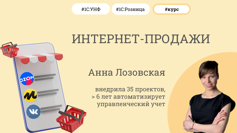 Уже продаете онлайн? Для вас есть инструмент, который поможет вывести интернет-торговлю на новый уровень. Приглашаем на новый онлайн-курс «Интернет-продажи в 1С:Рознице и 1С:УНФ». Курс подойдет для тех, кто хочет больше узнать о возможностях онлайн-торговли в наших решениях, а также: За 37 уроков вы сможете автоматизировать и управлять интернет-продажами вашего бизнеса с помощью 1С:Розницы и 1С:УНФ, научитесь работать с онлайн-кассами, разберетесь с финансовыми отчетами. Ведущая курса: Анна Лозовская, исполнительный директор компании SOL-IT, успешно внедрила 35 проектов на 1С:УНФ, более 6 лет занимается автоматизацией управленческого учета, автор более 12 вебинаров. Узнать подробности и записаться на курс — здесь.