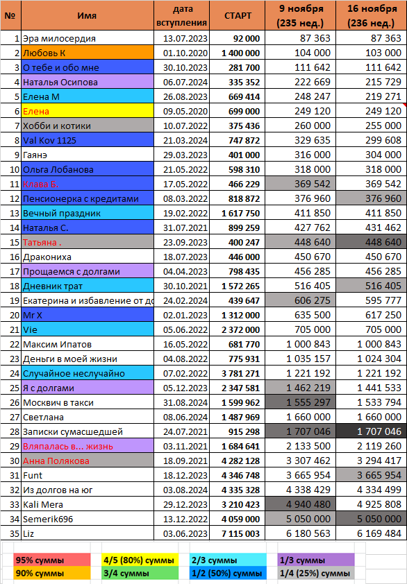 В этот раз новостей и событий не очень много. Явка была не очень хорошей: шестеро пропустили перекличку, причем некоторые из них уже не в первый раз. А я напомню, что после третьего пропуска подряд участник выбывает из марафона. За этот год уже трое таким образом покинули марафон, а у нас есть желающие занять освобождаемые места! Val Kov 1125 погасил 30027p и занял первое место! На втором и третьем - Елена М и Москвич в такси, погасившие 28976 и 21503 рублей соответственно. Поздравляем! А в погашении процентов от долга первое место занимает Елена М: её долг "похудел" на 11,67%. Val Kov 1125 на втором месте: он погасил 9.11% от долга. На третьем месте - Гаянэ с результатом всего минус 3,8%. Так держать, молодцы! В остальных номинациях изменений не было: кто на каких местах был, на тех и остаётся. А результаты всех участников - как обычно, в карусели таблиц: Ну и моя любимая рубрика - изменение цвета. Сегодня очередной рубеж преодолела Елена М: Она погасила 2/3 долга и получает бирюзовый
