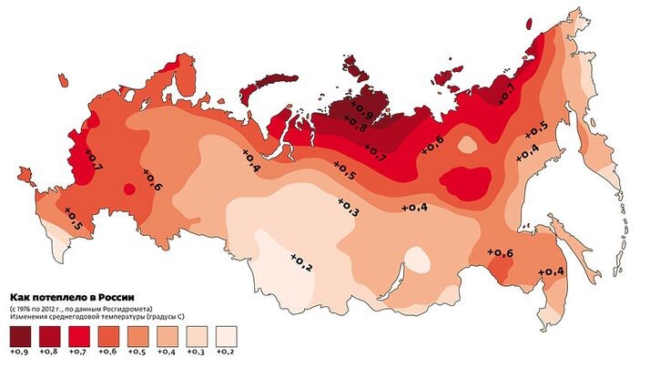 С 1976 года по 2012 г. на севере, в Арктической области потеплело составило почти градус. Южнее это не ощущалось, летние и зимние периоды были как обычно. Но климат резко начал теплеть и за последние 10 лет картина выглядит так: