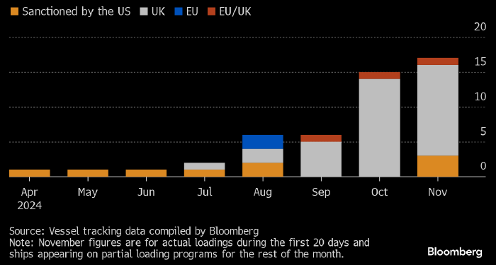 Если Запад всерьез намерен нанести удар по нефтяным доходам России, то лучшей возможности, чем сделать это за несколько недель до вступления в должность избранного президента США Дональда Трампа, ему не найти, пишет стратег Bloomberg по рынку нефти Джулиан Ли. Число судов под санкциями США (оранжевым), Великобритании (серым), ЕС (голубым) и Великобритании/ЕС (бордовым), участвующих в перевозке российской нефти. Данные и источник: Bloomberg Падение цен на нефть и надвигающийся период ее избыточного предложения могут создать прекрасную возможность для ужесточения санкций против российского экспорта, которое по-настоящему сократит доходы Москвы. Существующий механизм ценового потолка, который мало что сделал в плане сокращения доходов страны, был введен по настоянию Администрация США. Тогда Вашингтон опасался, что более сильный удар по российской нефти приведет к резкому росту цен, но сейчас такого беспокойства уже нет. Даже в условиях геополитической напряженности на Ближнем Востоке, дос