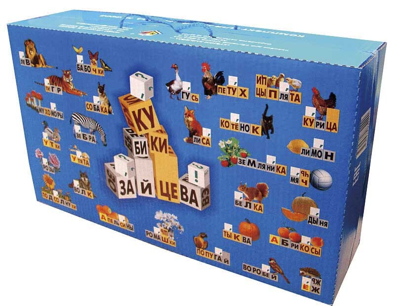 Более двадцати лет эти кубики знакомят детей с буквами и учат составлять слова и слоги. Они позволяют понять, как различаются гласные и согласные, глухие и звонкие звуки. Всего в наборе 52 кубика, на каждом из которых изображены склады — сочетания согласной и гласной буквы. Кубики различаются по цветам и размерам, на больших изображены твёрдые склады, а на маленьких — мягкие. Во время занятий родителям рекомендуется проговаривать или пропевать склады, чтобы ребёнок лучше их запомнил.