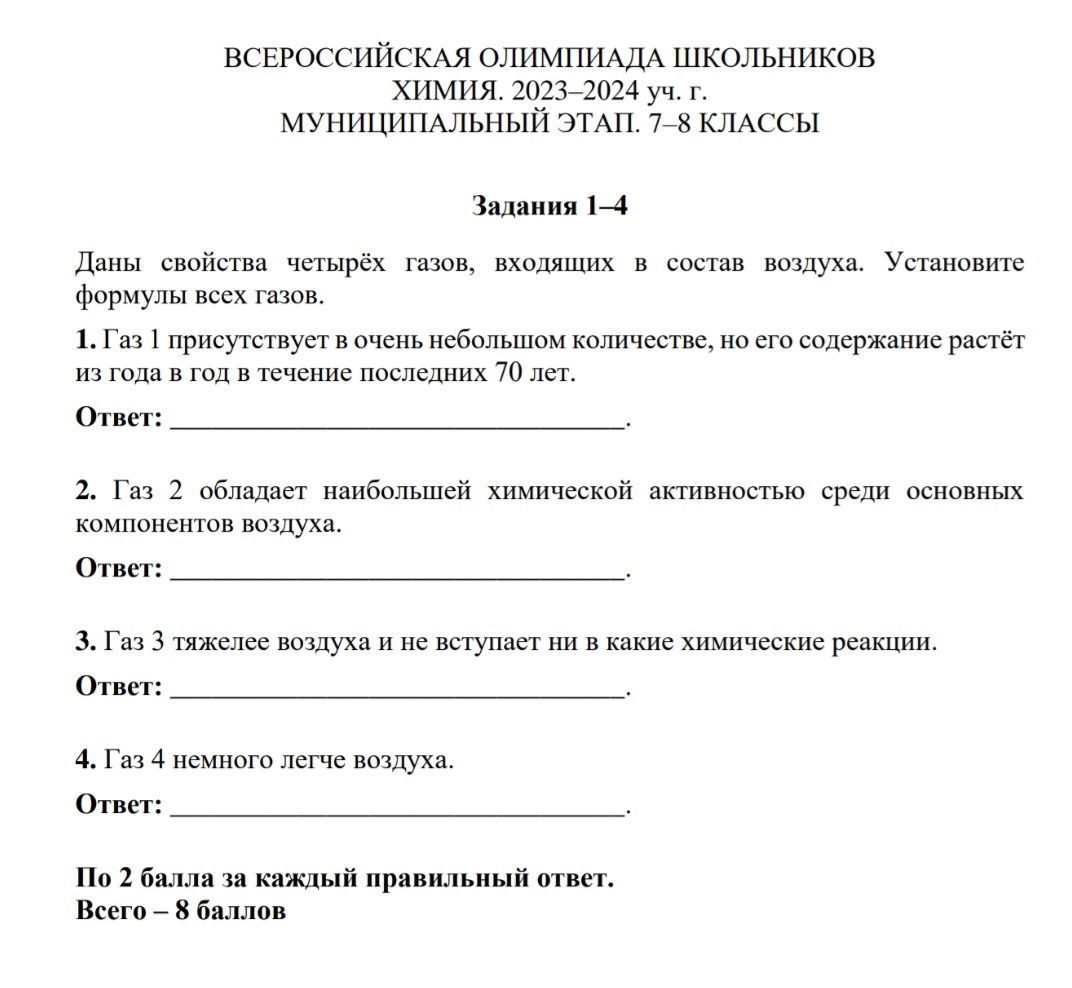 Ответы👇 ВСЕРОССИЙСКАЯ ОЛИМПИАДА ШКОЛЬНИКОВ ХИМИЯ. 2023–2024 уч. г. МУНИЦИПАЛЬНЫЙ ЭТАП. 7–8 КЛАССЫ Задания 1–4 Даны свойства четырёх газов, входящих в состав воздуха. Установите формулы всех газов. 1. Газ 1 присутствует в очень небольшом количестве, но его содержание растёт из года в год в течение последних 70 лет. Ответ: ________________________________. 2. Газ 2 обладает наибольшей химической активностью среди основных компонентов воздуха. Ответ: ________________________________. 3. Газ 3 тяжелее воздуха и не вступает ни в какие химические реакции. Ответ: ________________________________. 4. Газ 4 немного легче воздуха. Ответ: ________________________________. По 2 балла за каждый правильный ответ. Всего – 8 баллов Задание 5 Водный раствор неизвестного вещества X при внесении в него некоторого количества тёмно-коричневого порошка Y «закипает» с выделением простого газообразного вещества Z без цвета и запаха. Вещество Y в ходе реакции не расходуется. Вещество Y при сильном нагре