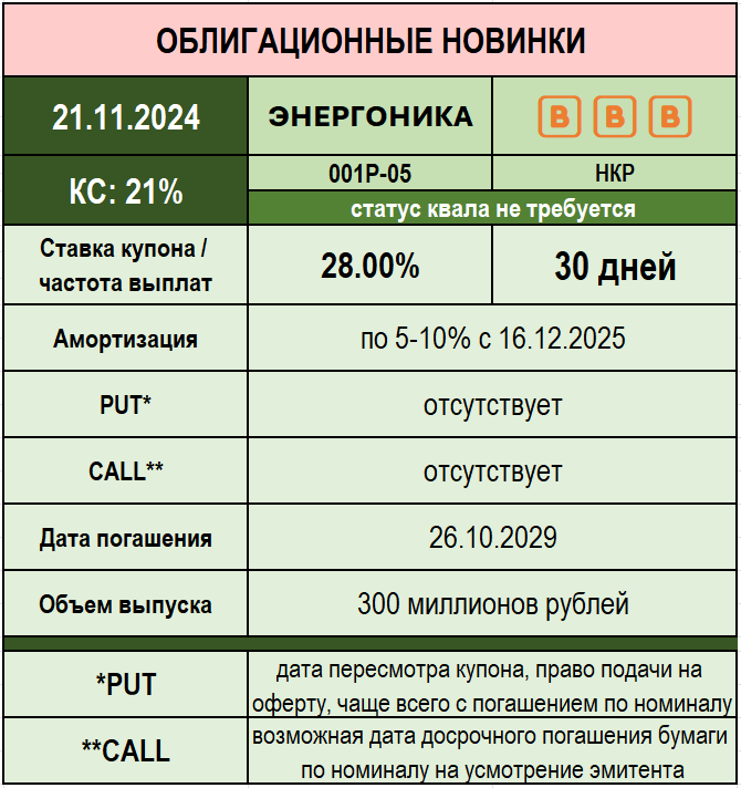 🕰 Утро доброе, дорогие читатели! Единственная новинка сегодня стартует на долговом рынке, к ней и все внимание :) ✅ Любители долгосрочной игры приглашаются на первичку до 13 часов и в стакан в 16:30: 1️⃣ ЭНЕРГОНИКА 001Р-05 (🅱️🅱️🅱️) 🔢 ISIN: $RU000A10A4C1 🔸 Купон фиксированный: 28% 🔸 Без оферт и досрочного погашения 🔸 Погашение через 5 лет 🔸 Сектор Роста Московской биржи 🔸 Последний рейтинговый отчет: https://ratings.ru/ratings/press-releases/Energonica-RA-260824/ Любопытный выпуск на перспективу, но со своими подводными камнями. На номинальной цене средней доходности по рейтингу в моменте проигрывает, но неприятность может сгладить достаточно высокая купонная ставка. Основной риск - попадание в реестр недобросовестных поставщиков, что и произошло летом этого года. Достаточно оперативно компании удалось решить вопрос об исключении из черного списка на время судебного разбирательства, и, безусловно, я с оптимизмом смотрю в будущее, но в голове стоит держать разное развитие