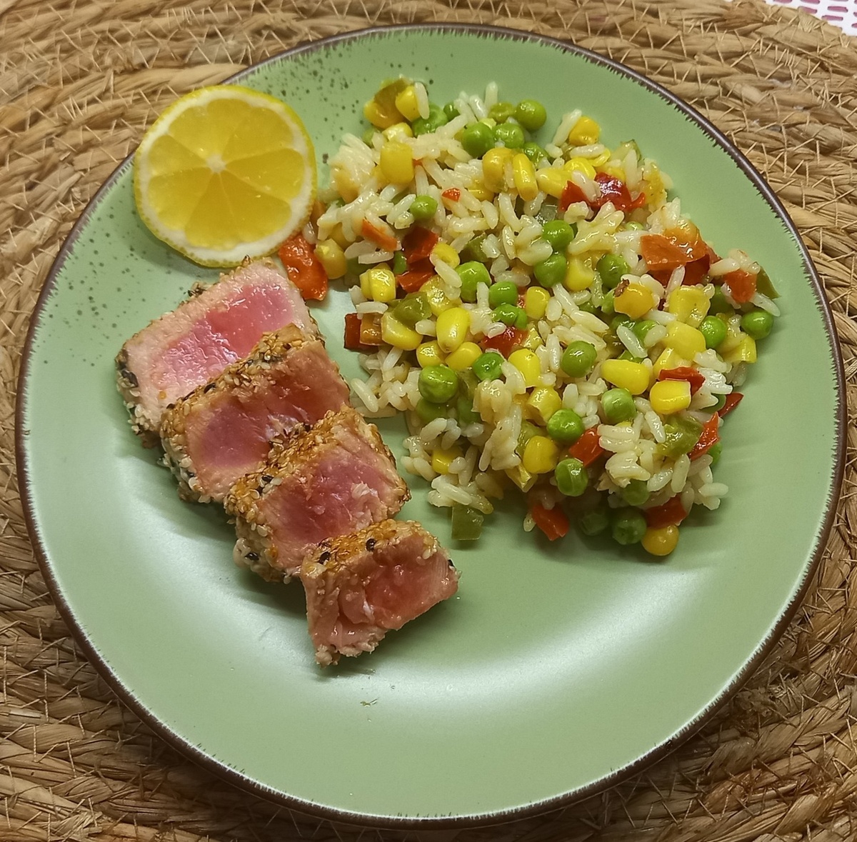 растительное масло для жарки Начинаем с рыбки: на необходимы кусочки по 3см, поэтому очень удобно сразу брать тунец готовыми стейками. Готовим маринад: В этой смеси маринуем рыбку полчаса Затем обваливаем каждый кусочек в кунжуте ...и на горячую сковороду при среднем огне без крышки. ВАЖНО! с каждой стороны тунец жарится 3 минуты, не более. Рыба готова тогда, когда у вас есть розовая прослойка между зажаренными краями. Горячим разрезаем стейки на кусочки и подаем с любимым гарниром. Тунец получается нежнейшим внутри с тонким особенным ароматом. Это очень сытное и вкусное блюдо. Готовьте с уд
