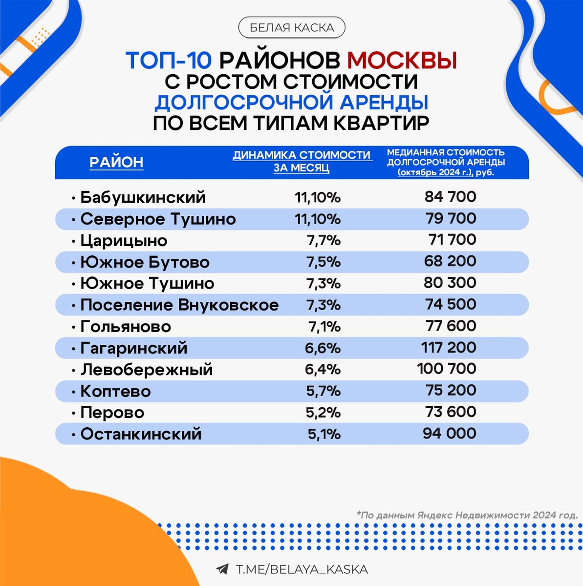 Увеличение медианных ставок отмечается в основном в спальных районах города. Максимальный рост в октябре был зафиксирован в Бабушкинском районе (СВАО) и в Северном Тушино (СЗАО) – на 11,1%.