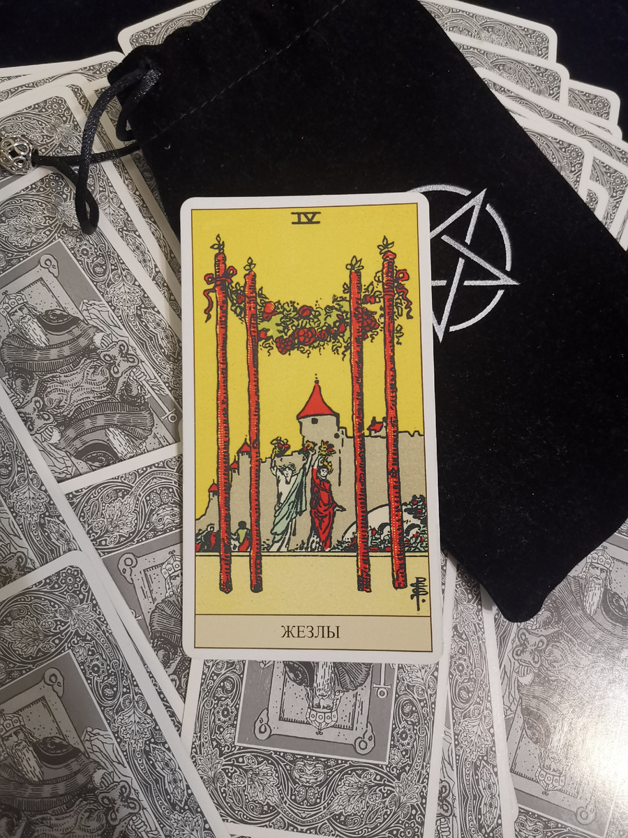 Тема в колоде Уэйта: структура Для большинства людей и в большинстве традиций число четыре означает структуру, материю и стабильность физического мира. Картинка на карте Уэйта в этом отношении довольно сильная: простая беседка - четыре жерди, и цветочная сень сверху. Огонь обретает структуру, но излишне открытую стремящуюся к радости и празднику. Город, открывающийся на заднем плане, обнесён крепостной стеной - и он символизирует более устойчивую, незыблемую структуру, определяющую нашу повседневную жизнь: ответственность, работа, долг, правила. Поскольку беседка напоминает свадебный балдахин ( особенно характерные для еврейской традиции: под ним жених с невестой стоят на протяжении брачной церемонии), то некоторые тарологи считают, что карта указывает на брак.