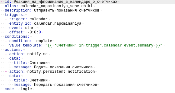 Ну, событие мы и так обрабатываем именно в календаре напоминаний. Что именно изменилось...? Мы добавили условие, при котором будут выполняться действия. В данном случае мы проверяем наличие в названии события слова "Счетчики" и только при соблюдении этого условия отправляем сообщение и уведомление. Аналогично делаем обработку для события с выключением чайника, где автоматизация сработает при наличии в названии события слова "Чайник" (это напоминалка для выключения чайника на работе при уходе вечером, но создал ее просто для теста, так как в реальности с подобным отлично справляется будильник в телефоне)