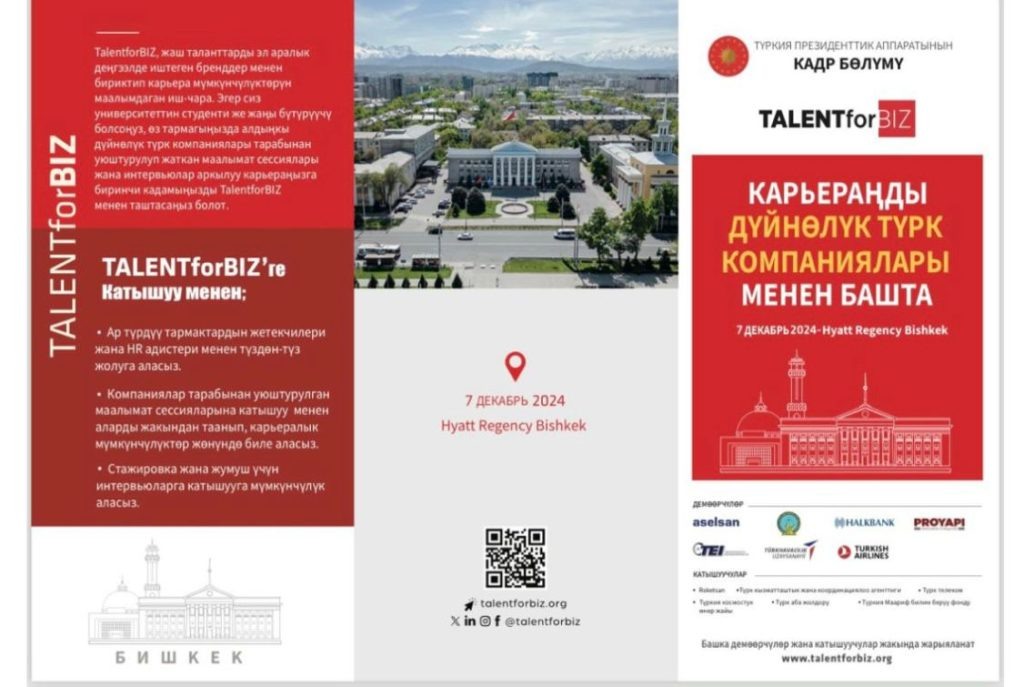 7-декабрда Бишкектеги Hyatt Regency мейманканасында Түркия президентинин алдындагы адам ресурстары департаменти тарабынан уюштурулган TalentforBIZ семинары өтөт. Программа жаштарга карьера мүмкүнчүлүктөрү жана жумушка орношуу мүмкүнчүлүктөрү тууралуу маалымат берүү менен дүйнөлүк таланттарды түрк компанияларына тартууну максат кылууда. 🌍 Бишкекте дүйнөлүк таланттарды Түркияга тартууга багытталган TalentforBIZ семинары өтөт. 📅 Иш-чара 7-декабрда Hyatt Regency мейманканасында өтөт жана Түркия президентинин алдындагы адам ресурстары бөлүмү тарабынан уюштурулат. 💼 TalentforBIZ – бул Түркиянын эл аралык компанияларда карьерасын өстүрүүнү каалаган жаш адистер үчүн борбор болууга жардам берген программа. 🌟 Уюштуруучулар семинарлар чет өлкөдөгү студенттерге жана жаш адистерге түрк компанияларындагы карьера мүмкүнчүлүктөрү тууралуу маалымат берүү максатын көздөөрүн баса белгилешти. 🤝 Иш-чаранын алкагында түрк бренддери ар кайсы өлкөлөрдөн келген таланттар менен таанышып, кызматташууга жаңы