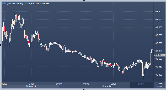Доллар падает, поскольку рынок оценивает политику Трампа и перспективы ДКП ФРС; биткоин растет График индекса доллара интервалами в 5 минут В четверг доллар США приостановил свой рост, поскольку трейдеры ожидали большей ясности относительно планов избранного президента США Дональда Трампа и пытались оценить перспективы снижения процентных ставок Федеральной резервной системой. В то же время биткоин резко вырос до отметки в 100 000 долларов, продолжая свой стремительный рост последних недель, вызванный надеждами на то, что новый президент создаст более благоприятную правовую среду для криптовалют. В четверг биткоин достиг рекордного максимума в 97 902 доллара, чему способствовало сообщение о том, что социальная сеть Трампа ведёт переговоры о покупке криптовалютной торговой компании Bakkt. В последний раз он вырос на 2,54% до 96 860 долларов. Индекс доллара снизился на 0,11% до 106,49, но сохранил большую часть роста предыдущей сессии после того, как инвесторы повысили индекс доллара по