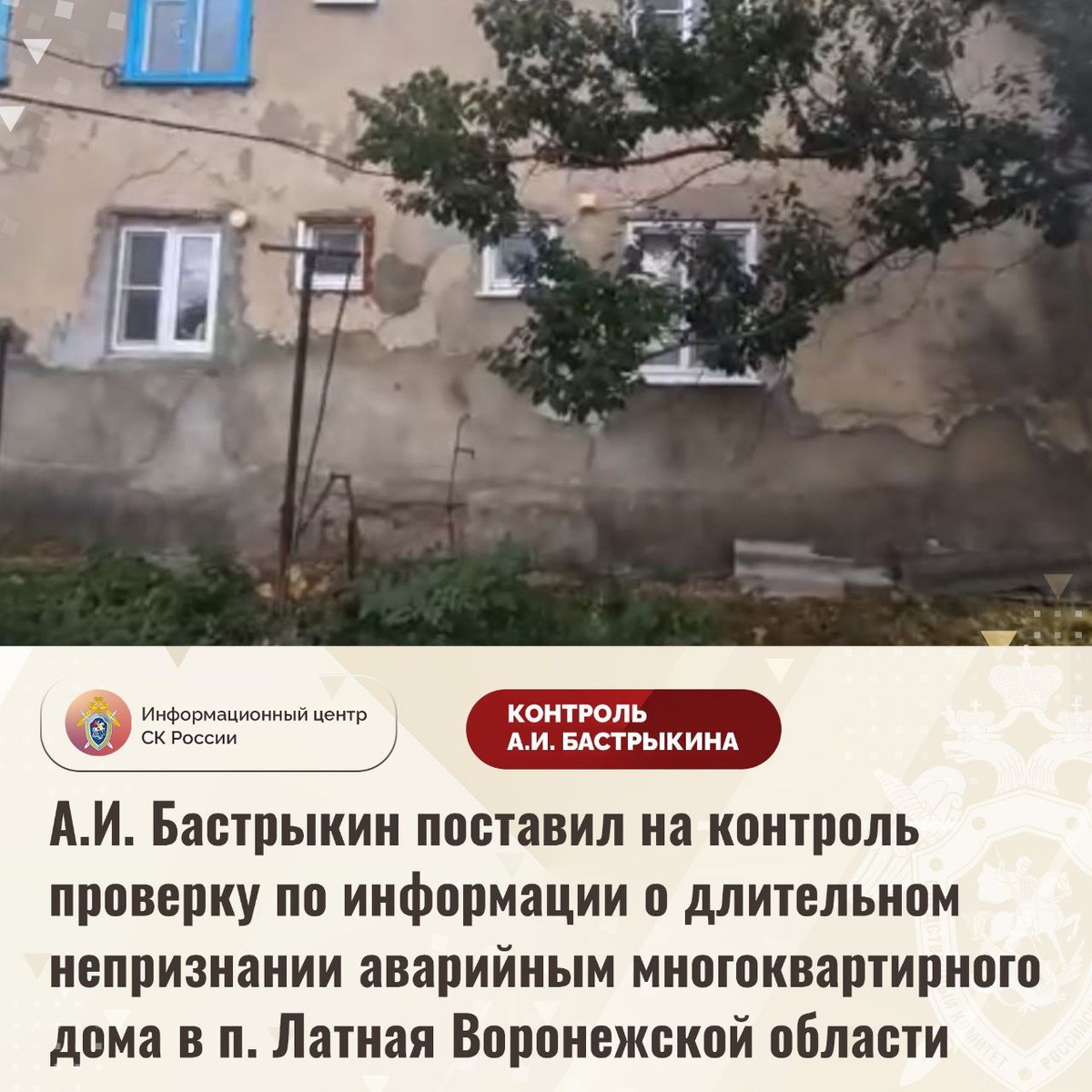Об этом сообщил телеграм-канал ведомства. Александр Бастрыкин поставил ход процессуальной проверки на контроль в центральном аппарате Следственного комитета и поручил руководству регионального Следственного управления СК представить доклад о промежуточных результатах процессуальной проверки и принятом по итогам решении. Ранее Народный фронт рассказал о разрушаюшемся многоквартирном доме в посёлке Латная Семилукского района, в котором, в том числе, проживают семьи трёх участников специальной военной операции. Собственники квартир пожалоаались на прямую линию президента. Мы настаиваем на признании деревянной двухэтажки аварийной и дальнейшем расселении жильцов. Капремонт ей уже не поможет.