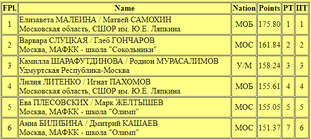 Люба Рубцова (66.60 - 5 место) получила на этот раз гораздо меньше судейских замечаний, чем на своем первом этапе в Казани, где она набрала лишь 59 баллов. Значительно выросли и техника, и компоненты. Отметим все вращения на 4 уровень и риттовый каскад 3+3, который выделял Любу среди всех фигуристок. Пока все для нее идет по плану - если Люба останется на пятом месте, то пройдет отбор на свое уже третье юниорское Первенство России.