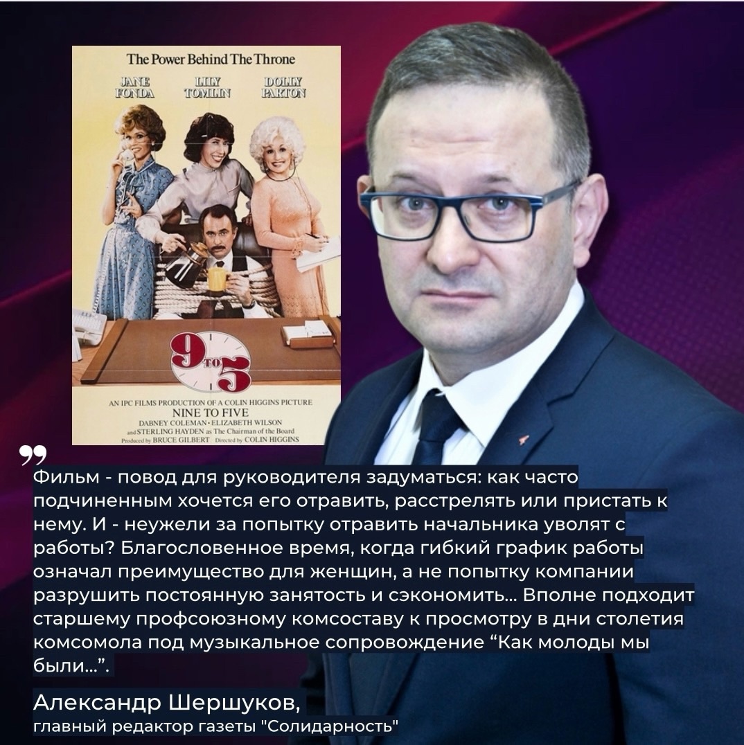 В рамках подборки #киномеханика рекомендуем вам к просмотру фильм «С девяти от пяти» (1980г., США). Фильм про будни сотрудников офисного центра. Основная часть коллектива в офисе женщины, а руководит ими зазнавшийся босс, который только и повторяет фразы про дух коллективизма, про то, что “все мы здесь одна дружная семья”, а еще, конечно же, склоняет секретаршу к нерабочим отношениям. Профсоюза в компании, где работают героини фильма, нет, поэтому, чтобы поставить босса на место, они обращаются к радикальным методам.