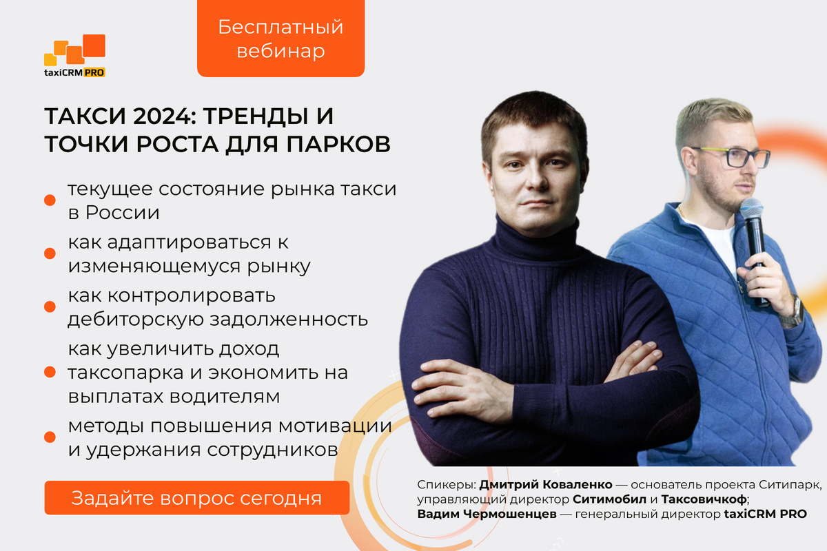 Спикеры вебинара: Дмитрий Коваленко — основатель проекта Ситипарк, управляющий директор Ситимобил и Таксовичкоф, Вадим Чермошенцев — генеральный директор taxiCRM PRO