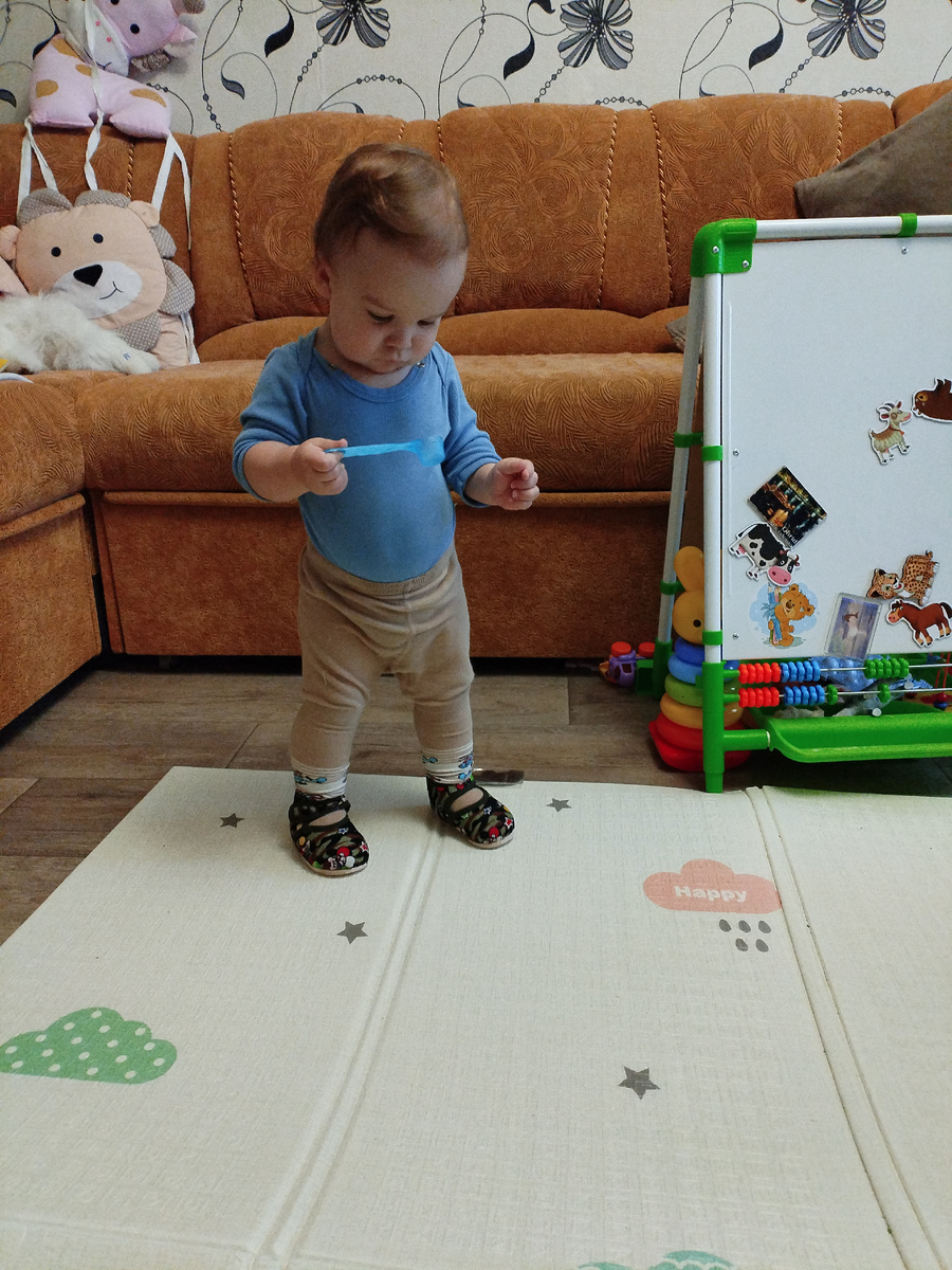 Амелия взбирается по ступенькам на горку, потом слезает или попку свесит и раскачивается. И на треугольник Пиклера поднимается на 2 ступеньки. Вот только смотри и смотри. Батареи в игровой мы завесили уодеялами, боюсь головой Амелька стукнется об них.