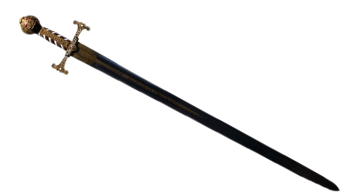 В начале XVI века личное оружие предназначалось в первую очередь для демонстрации. Из-за хрупкости их гард, украшенных тонкой золотой эмалью, они не годились для боя, несмотря на качество их клинков, на желобах которых была надпись "CHATALDO ME FECIT". Архаичный почерк этой подписи привел к ошибочному предположению, что этот элемент был изготовлен более чем на сорок лет раньше, чем остальная часть оружия. Мастер по имени Пьеро Антонио Катальдо или Чатальдо упоминается среди известных испанских оружейников начала XVI века. Однако типология штампов на клинке, таких как две "кометы", выгравированные на пятке, или буква "В", отходящая от креста, отмечающего конец дола, по мнению Лионелло Бочча, имеет флорентийское происхождение. Гравированные и позолоченные украшения, которыми украшены гарда и эфес клинка, а также эмблематические элементы, которыми отмечены последние, прекрасно гармонируют, хотя и более просто обработаны, с гардой меча, настоящим шедевром ювелирного дела. Это оружие сохра