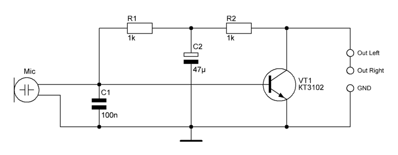 Усилитель для микрофона — неотъемлемая часть любого трансивера, работающего телефоном. Он преобразует звуковые или акустические колебания в электрический ток. Уровень выходного напряжения микрофона обычно недостаточен для дальнейшей обработки, можно программно усилить звук микрофона, но появляется много шумов, поэтому требуется дополнительный усилитель. Я выбрал простейшую схему на одном транзисторе. Эта схема не требует изготавливать печатную плату, буду делать навесным монтажом. Транзистор можно заменить на BC547, я поставил S9014. Резистор R1 ограничивает ток на микрофон, желательно подобрать по даташиту. Конденсаторы желательно этого номинала, увеличение или уменьшение усиливает шумы. Конденсатор С1 я взял smd и припаял прямо на транзистор. Остальные детали запаял навесным монтажом. Провод, термоклеем, приклеил к транзистору, чтобы не оторвался. В качестве корпуса использовал шприц на 5 мг, микрофон обёрнутый ватой, идеально установился в него. Ветрозащиту я сделал из поролон