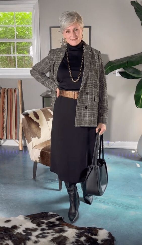 Наступление старости – процесс, к сожалению, неизбежный, однако в силах любой женщины сделать так, чтобы процесс этот прошел как можно более удобно, практично, стильно и элегантно. Стареть красиво можно, нужно только правильно на это настроиться и, конечно, подобрать правильный гардероб. 1. Матово-черная юбка-миди и черная блестящая водолазка – комплект стильный, визуально делающий женщину более стройной и, без сомнения, эффектный. Еще более элегантным для зрелой дамы его делает золотистый широкий ремень, подчеркивающий талию, и строгий жакет классического кроя в светло- и темно-серую клетку. Неброские украшения, лаконичная сумка и остроносые кожаные сапоги на высоком каблуке – все это необходимые для завершения образа стильные делали. 2. Светло-бежевое платье-миди А-силуэта, на талии стянутое широким кожаным ремнем, будет эффектно смотреться с тонкой леопардовой водолазкой, которую хорошо видно под расстегнутым V-образным вырезом. Темный оттенок водолазки, коричневый цвет ремня и замш