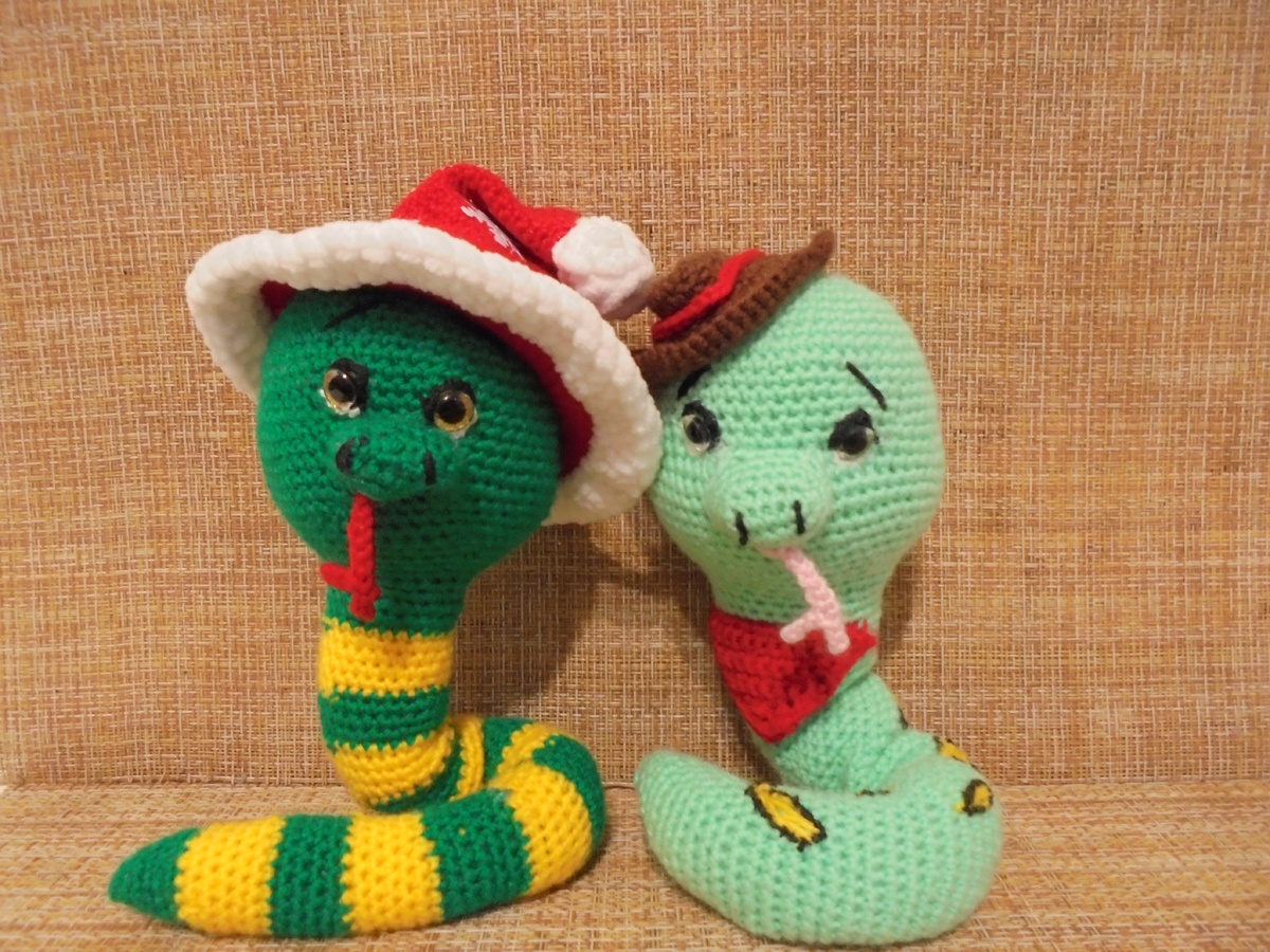 ожидала большего, но увы, второй вариант меня порадовал больше, тут я еще и прифантазировала немного, проволоку вставила сразу, когда связала голову, вставила проволоку, потом набила, и только тогда уже начала вязать тело, набивая его по ходу вязания, и результат получился довольно таки милым змеем