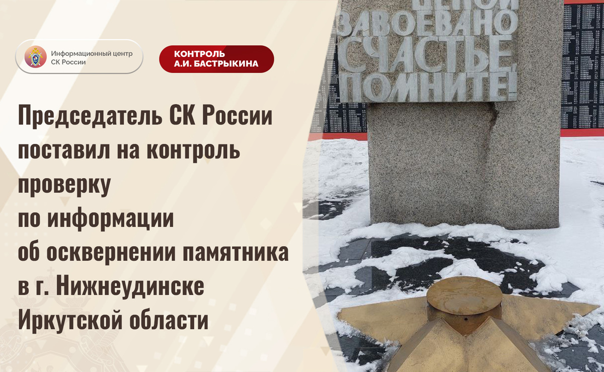Председатель СК России поставил на контроль проверку по информации об осквернении памятника в г. Нижнеудинске Иркутской области В социальной сети сообщается об осквернении символа памяти погибших в годы Великой Отечественной войны в городе Нижнеудинске Иркутской области. В ноябре текущего года неустановленные лица пытались повредить газовую горелку, расположенную в горловине звезды Огня Памяти, а также другое оборудование, после чего скрылись с места происшествия. В СУ СК России по Иркутской области по данному факту организована процессуальная проверка. Председатель Следственного комитета Российской Федерации Александр Иванович Бастрыкин поставил ход процессуальной проверки на контроль в центральном аппарате ведомства и поручил руководителю СУ СК России по Иркутской области Анатолию Викторовичу Ситникову представить доклад о ее промежуточных результатах и принятом по итогам решении. #СледственныйКомитет #СКРоссии #СКР #ИЦСКР #ИнформационныйЦентр #АлександрБастрыкин #ПредседательСКР #Ко