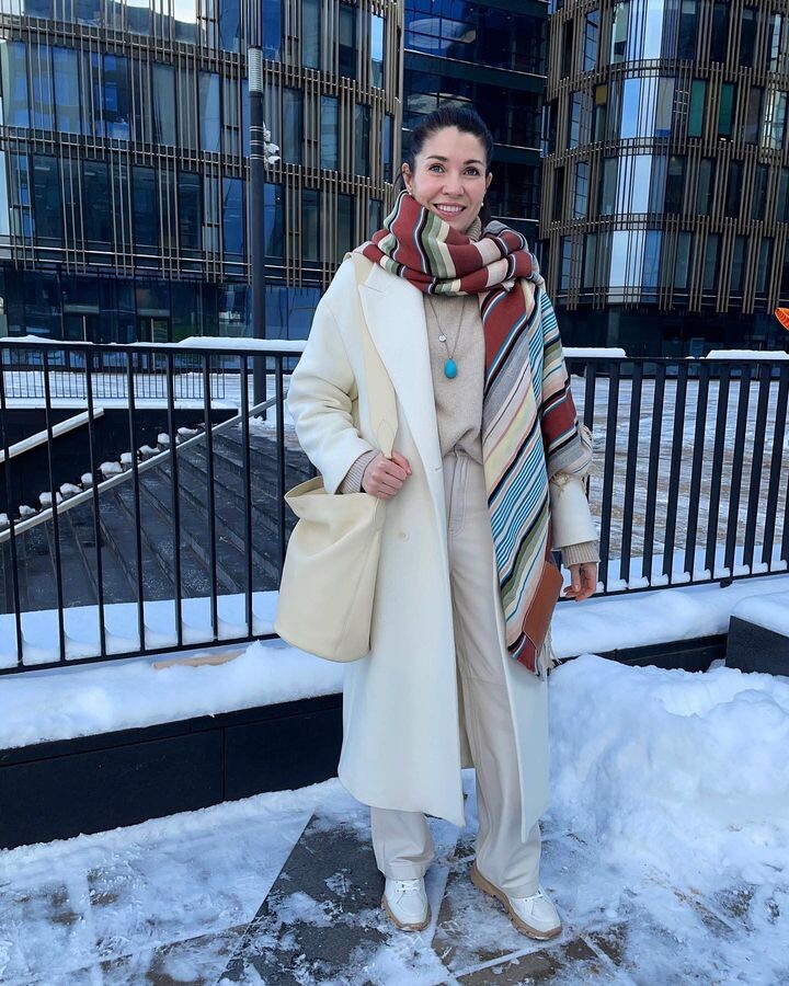 В холода можно смело носить пальто с меховыми карманами. Молочное пальто + черный свитер + кожаные брюки + принтованный шарф и теплые аксессуары – контрастный сет на зиму готов!