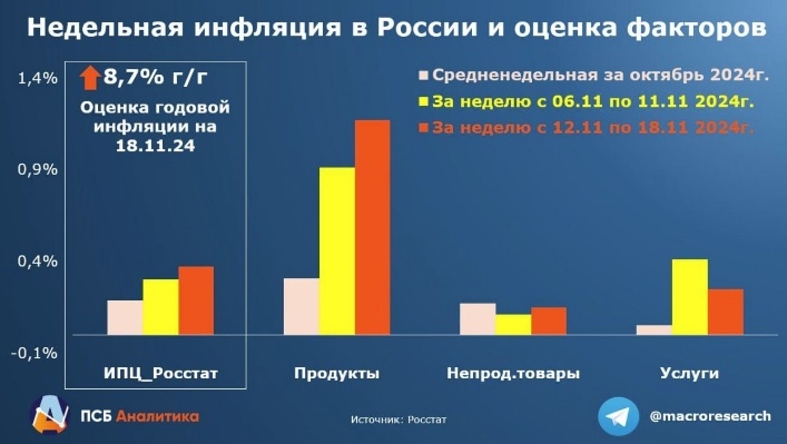 "Инфляция составила 0,37% н/н за 12-18 ноября, по состоянию на 18 ноября цены выросли на 0,79% с начала ноября, - подчеркивается в обзоре банка. - Ключевым фактором ускорения недельной инфляции - в предыдущую неделю цены выросли на 0,3% н/н - стал ускорившийся рост цен на продовольственные товары. При такой динамике цен по итогам ноября инфляция составит 1,2-1,5% м/м, и, по всей видимости, по итогам года показатель инфляции превысит 9,0% уровень. В таких условиях повышение ключевой ставки до 23% в декабря уже не подлежит сомнению, и существенно растет вероятность, что ЦБ РФ может пойти и на более жесткий шаг".