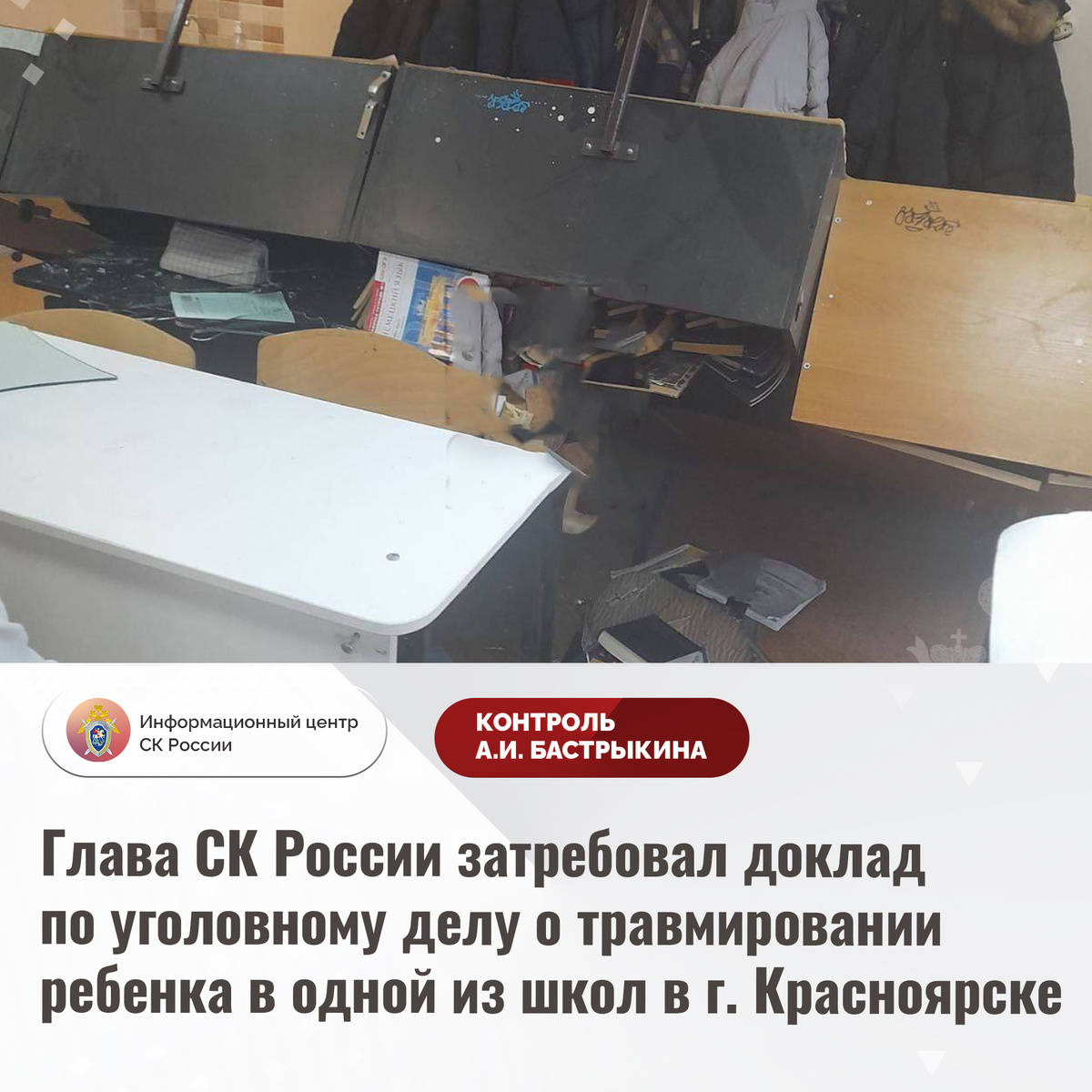 Глава СК России затребовал доклад по уголовному делу о травмировании ребенка в одной из школ в г. Красноярске Внимание Председателя СК России А.И. Бастрыкина обращено на публикации в СМИ и социальной сети о травмировании ребенка в результате падения на него книжного шкафа в одной из школ в городе Красноярске. 19 ноября текущего года незакрепленная надлежащим образом деревянная секция со стеклянными дверцами обрушилась на школьника. Пострадавший госпитализирован с травмами. В ГСУ СК России по Красноярскому краю и Республике Хакасии по данному факту возбуждено уголовное дело. Председатель Следственного комитета Российской Федерации Александр Иванович Бастрыкин затребовал у руководителя ГСУ СК России по Красноярскому краю и Республике Хакасии Алексея Леонидовича Еремина доклад о ходе и результатах расследования уголовного дела. Исполнение поручения поставлено на контроль в центральном аппарате ведомства. #СледственныйКомитет #СКРоссии #СКР #ИЦСКР #ИнформационныйЦентр #АлександрБастрыкин #