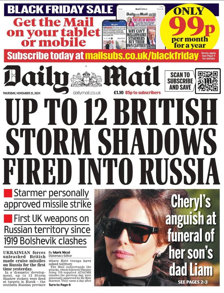 «Великобритания бросает вызов Путину, когда Украина стреляет британскими ракетами по России», «Украина запускает британские ракеты вглубь России»: Все британские обложки сегодня ликуют - Великобритания открыто вступила в войну с Россией.