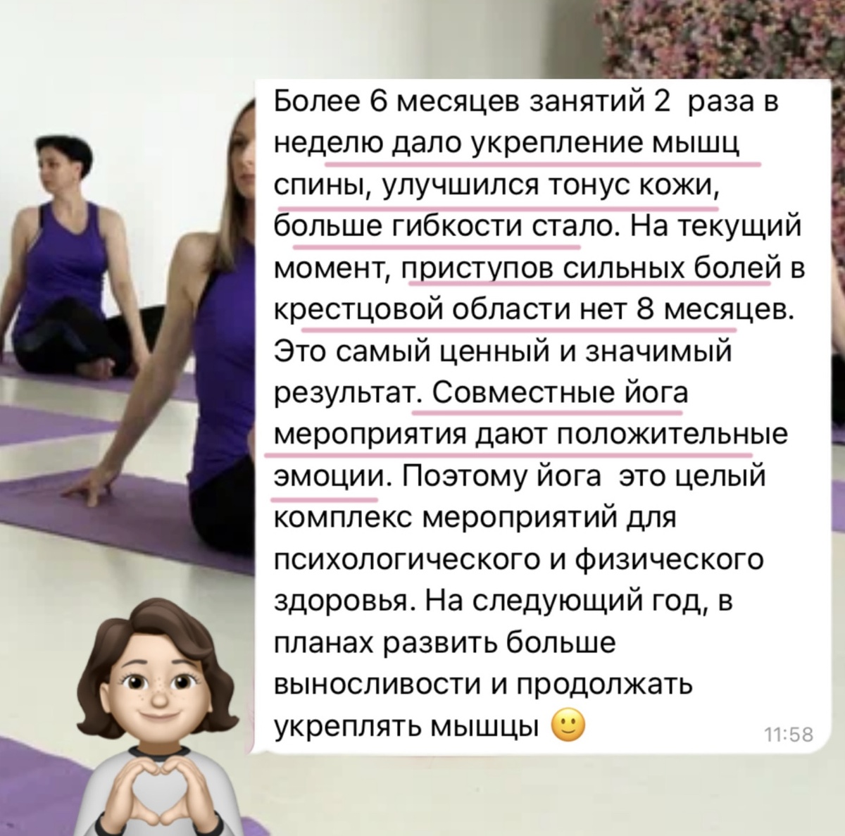 «На текущий момент, приступов сильных болей в крестцовой области нет 8 месяцев. Это самый ценный и значимый результат». Йога, действительно, ваш союзник в борьбе с болями в спине, а также для улучшения тонуса кожи!⠀ С каждым днем все больше людей сталкиваются с проблемами спины из-за малоподвижного образа жизни и стресса. Йога — прекрасное решение!⠀ Регулярные занятия йогой помогают укрепить мышцы спины, улучшить гибкость и осанку. Специальные асаны способствуют расслаблению напряженных мышц и снятию боли. Всего несколько минут практики каждый день могут значительно улучшить ваше самочувствие! Йога не только заботится о вашем теле, но и о коже! Во время занятий происходит активное кровообращение, что способствует насыщению клеток кислородом и улучшению обмена веществ. Это помогает коже выглядеть более свежей и упругой.⠀⠀ Начните свой путь к здоровью и красоте уже сегодня! Найдите время для себя, займитесь йогой и почувствуйте разницу. Ваше тело и душа скажут вам спасибо! ⠀