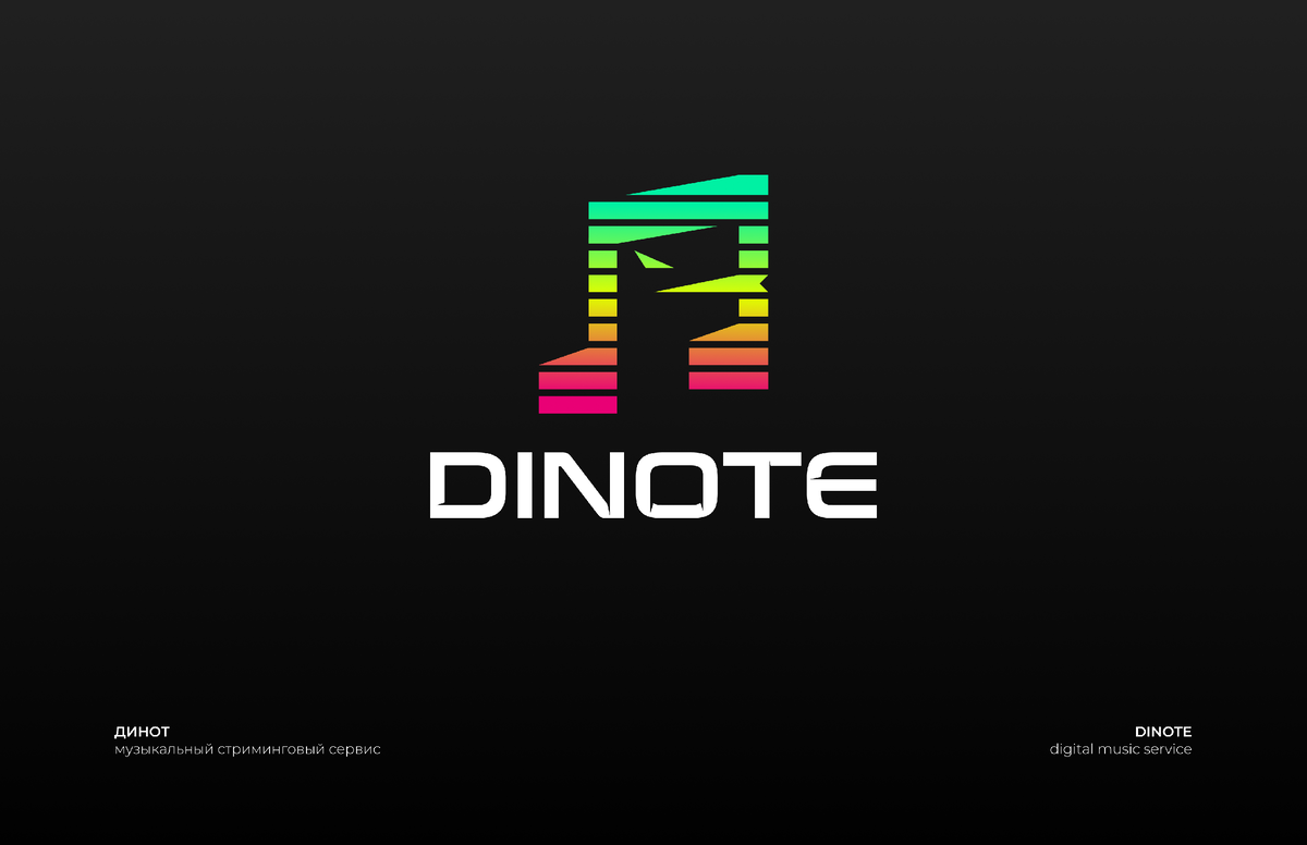 Представляю логотип музыкального стримингового сервиса Dinote. В основе логотипа лежит нота в виде эквалайзера, обрамляющая силуэт головы динозавра. Текстовый блок оснащён внутренними засечками, напоминающими когти и зубы ящера. Логотип имеет вертикальную и горизонтальную ориентации. В случаях использования лого на светлом бэкграунде, иконка помещается на чёрный квадрат с закруглёнными углами. Трёхцветный градиент отражает многожанровость и многофункциональность сервиса. Спасибо за внимание!