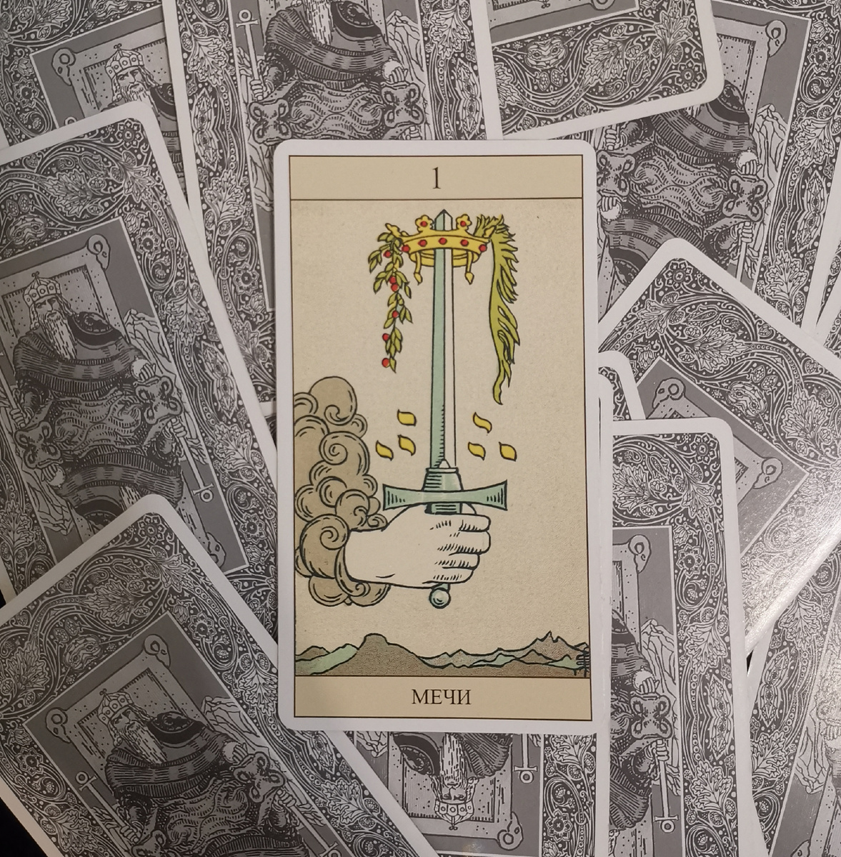 МЕЧ - первый артефакт, созданный исключительно с целью убийства других людей. Прочие режущие предметы - ножи и топоры - это прежде всего орудия труда или охоты. Меч не имеет иного значения, кроме битвы. Это придаёт всей масти агрессивность, и, как бы мы ни пытались окрасить её в благородные тона, оттенок всё равно присутствует. Меч принадлежал аристократии, для простолюдина даже одно владение им было серьёзным проступком. Хотя в наши дни многие видят в аристократии символ угнетения - само слово "благородный" придаёт ей некоторый оттенок идеализма. Уэйт описывал Короля Мечей, а не Кубков(!) например, как сэра Галахада, Рыцаря Святого Грааля. Мечи представляют воздух, который, в свою очередь, есть стихия разума. Тарологи считают, что он уничтожает иллюзии и проводит тонкие (и острые) различия. Жезлы придают Мечам больше оптимизма, Кубки - мягкости и даже любви, а Пентакли прекрасно заземляют ментальную энергию. Даже если в колоде на картах Мечей изображены сабли-скимитары, всё равно Т